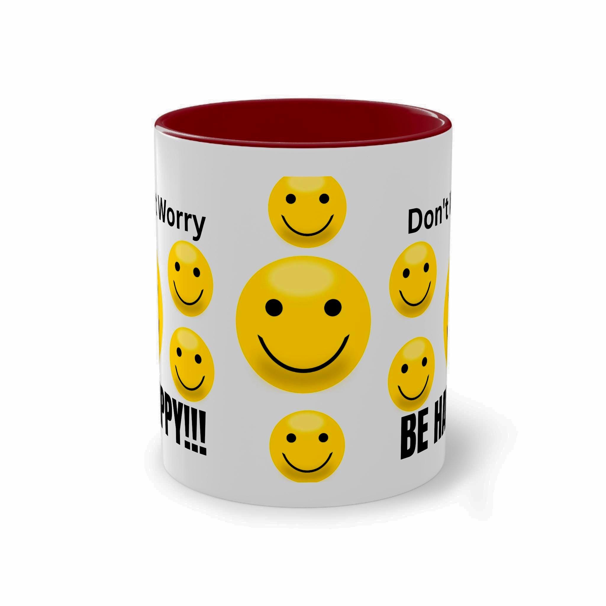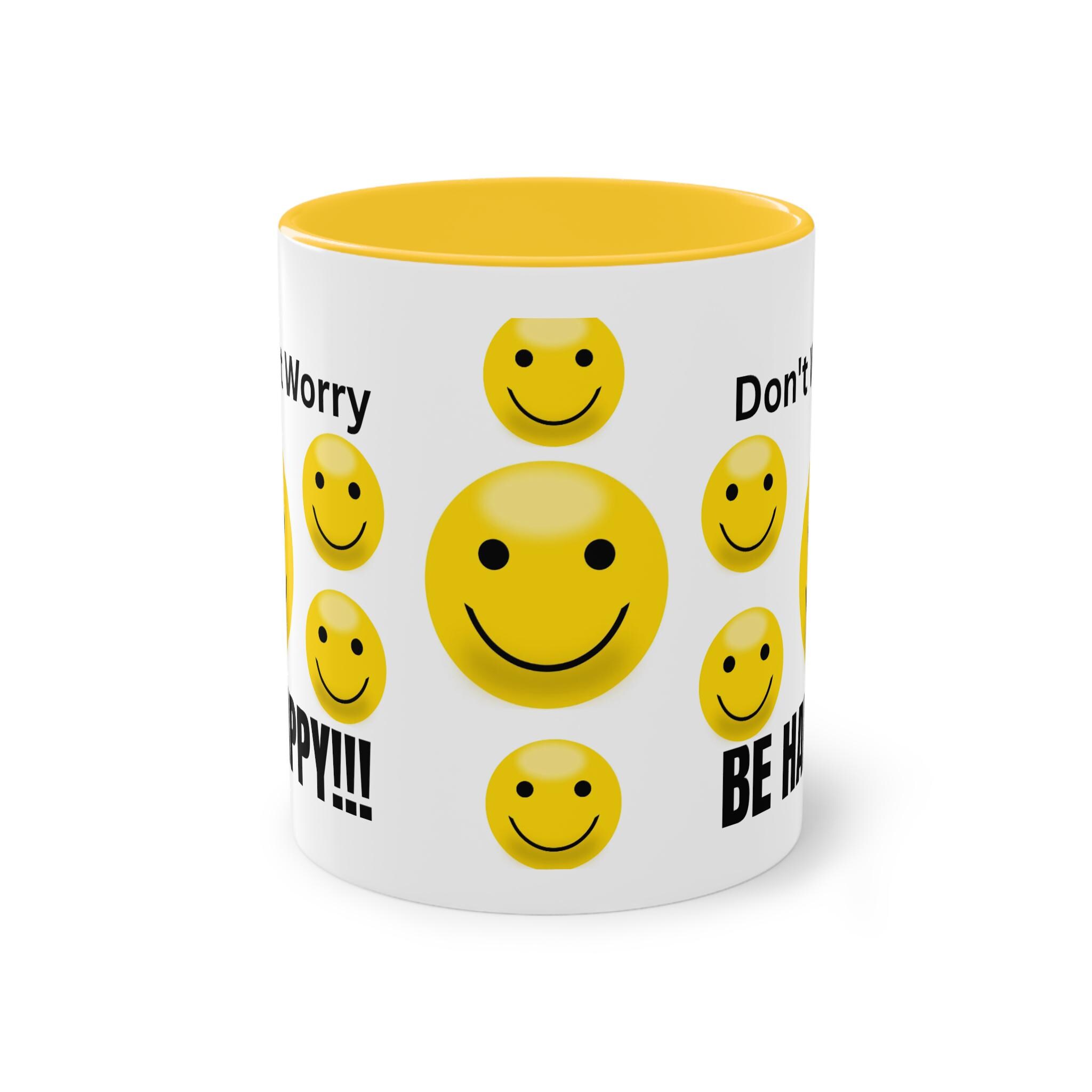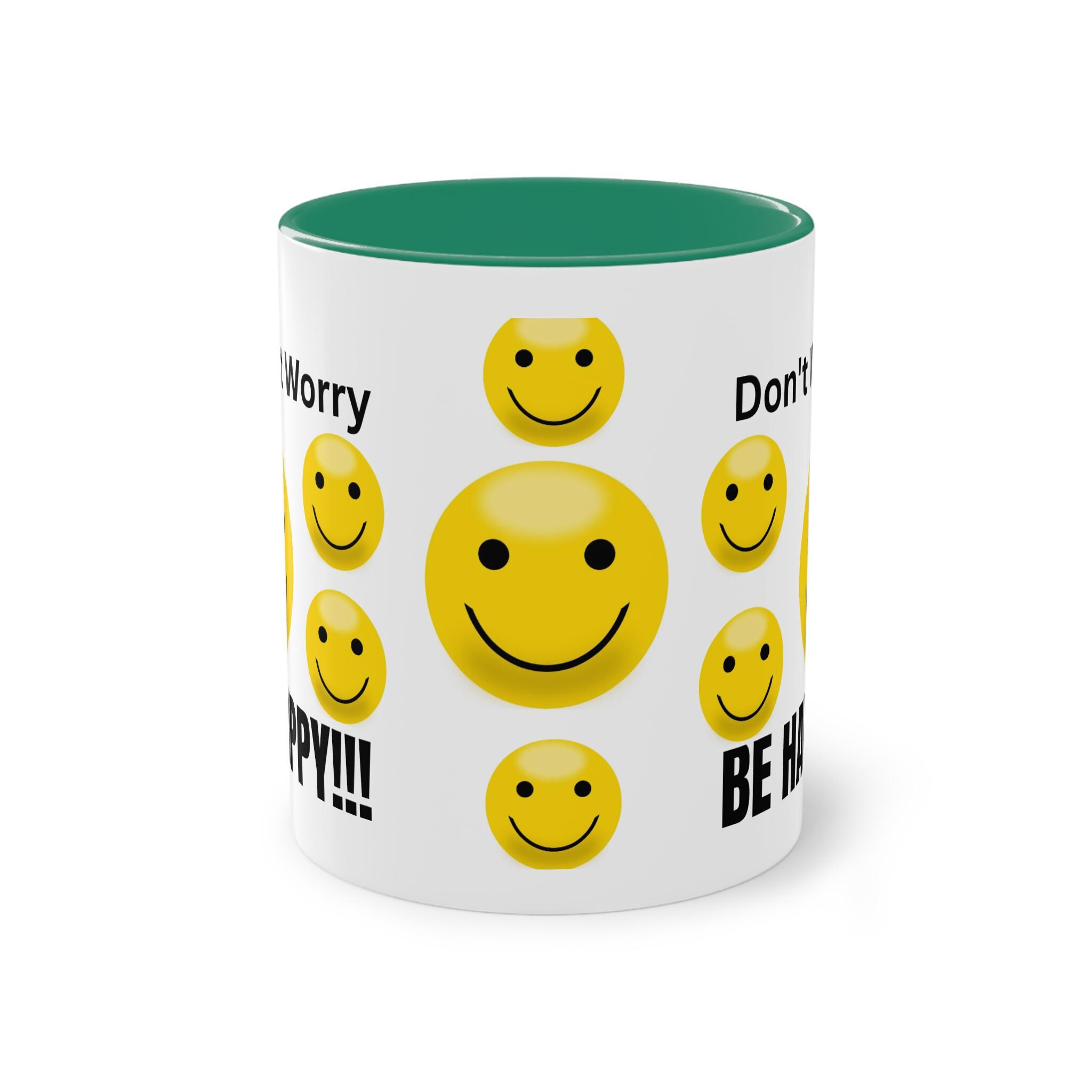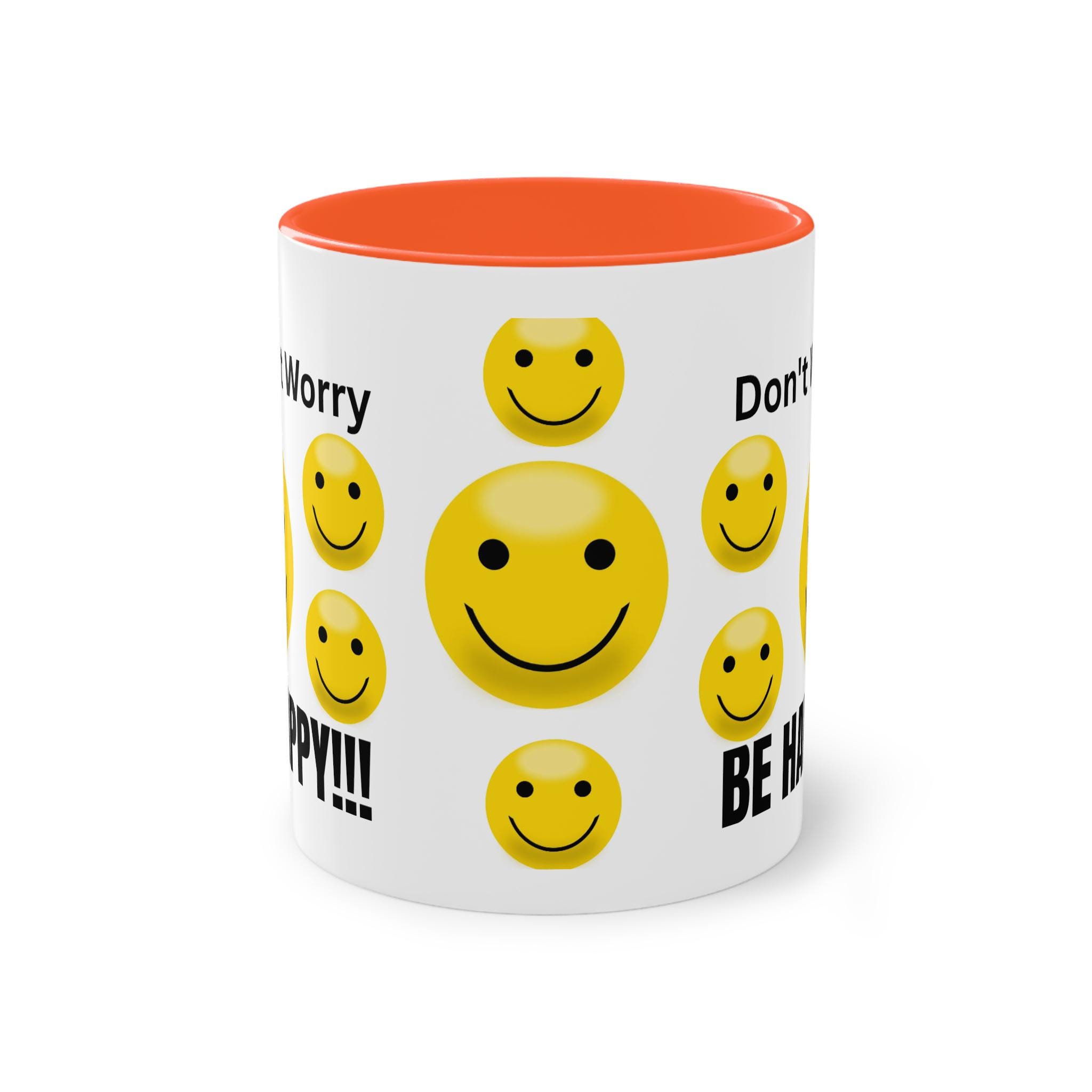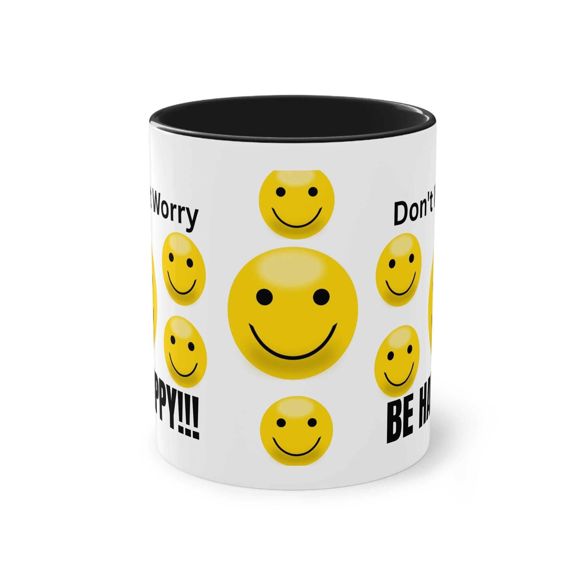 Coffee Mug Cheerful Two-Tone Coffee Mug - "Don't worry, be happy!" - Perfect gift for friends, funny office mug, motivational drinkware, good vibes. Add color to your day with this vibrant two-tone coffee mug! Perfect for your favorite beverages, this charming mug features a white exterior with an eye-catching multicolored interior and handle. It has a glossy finish that adds a touch of fun to your morning routine. Ideal for coffee lovers and tea fans, it brings good cheer to any kitchen. Whether you're spending a cozy evening at home or laughing with friends, this mug is your perfect companion. Ideal as a gift for holidays like Christmas, birthdays, or for special occasions like promotions or graduations! A perfect surprise for anyone who needs a bit of positivity in their everyday life, from friends to family. Product Features: - Dishwasher safe for easy cleaning - Microwave safe for convenient heating - Vibrant colors with clear printing - 100% ceramic construction.