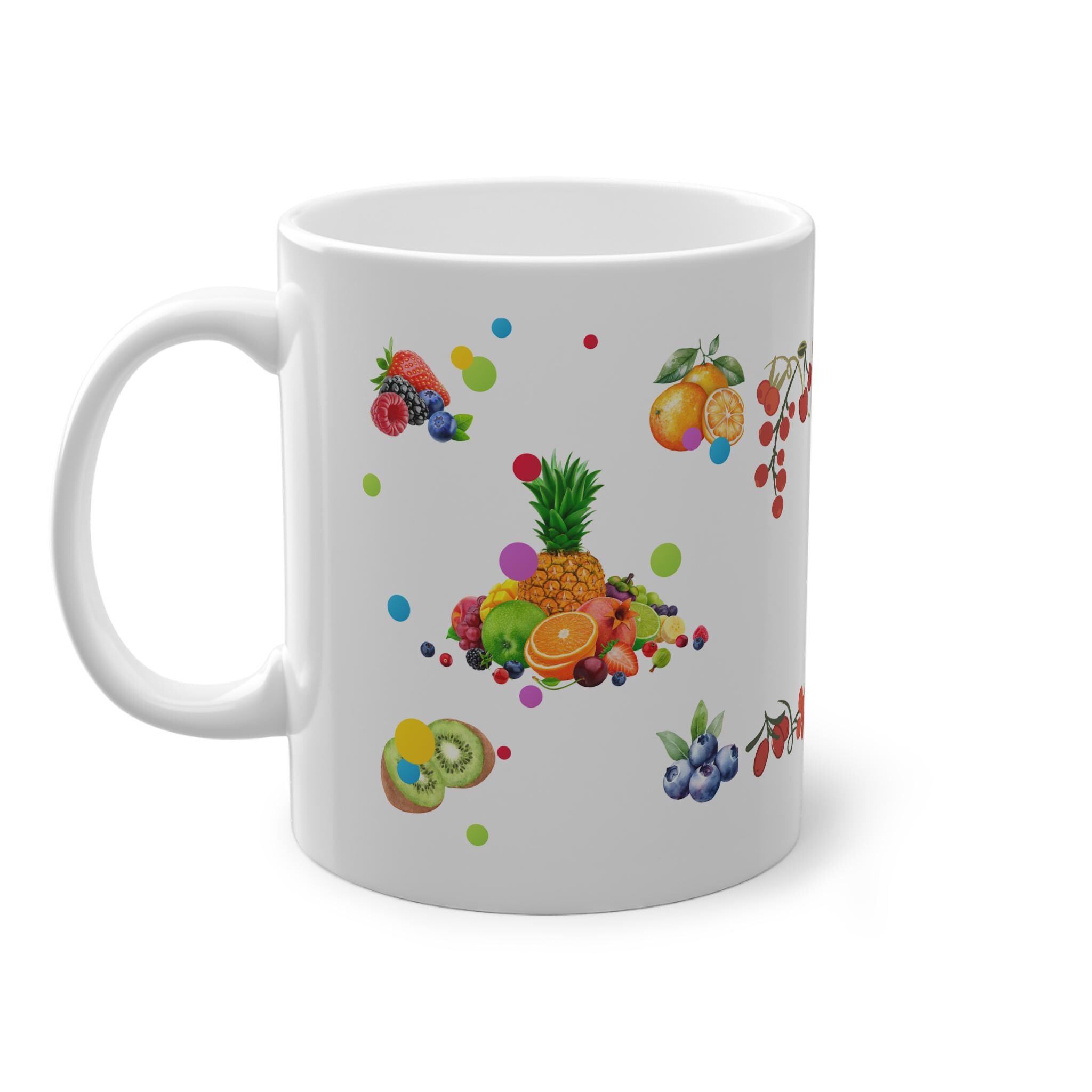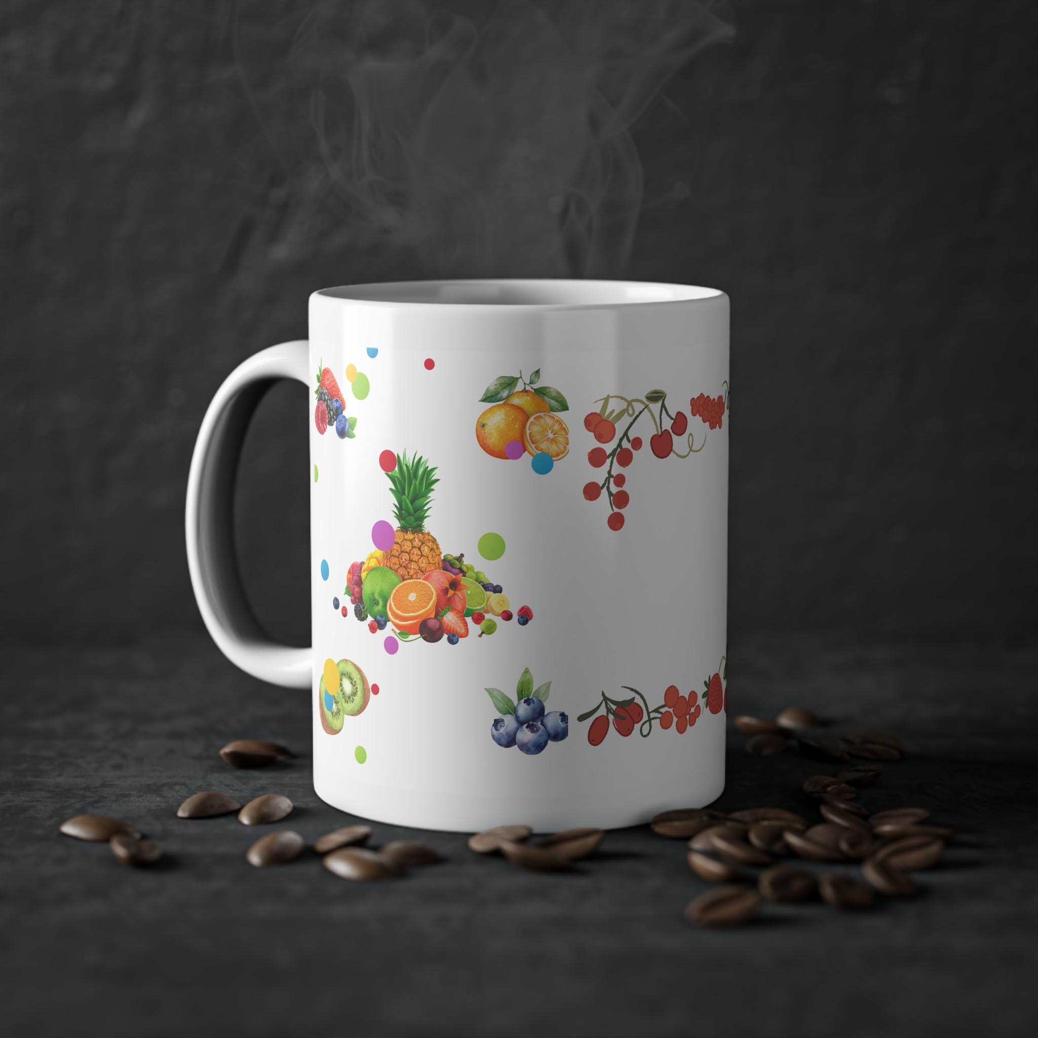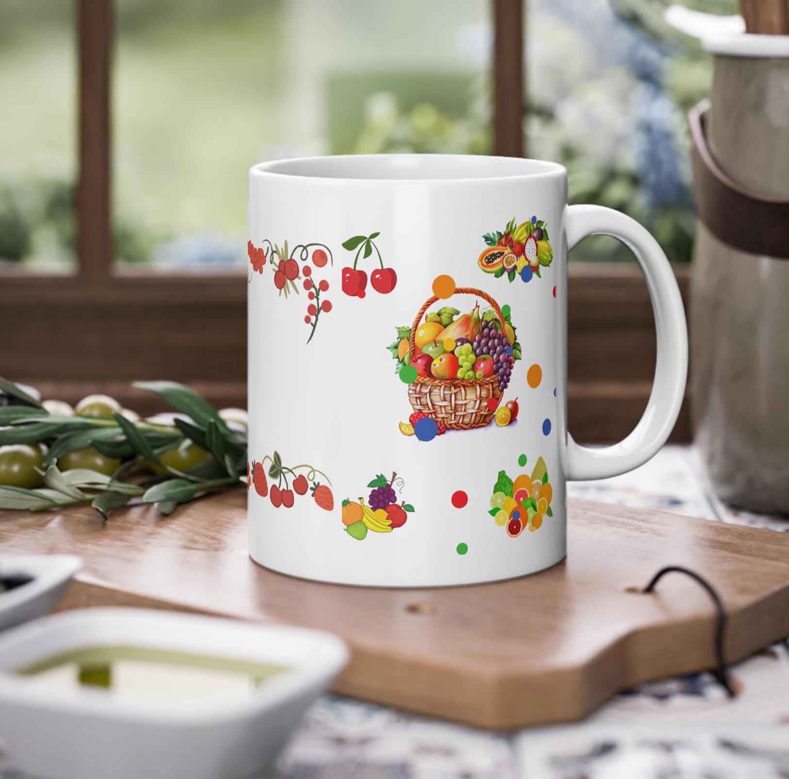 White mug with handle and fruit motifs for coffee and tea lovers. This mug exudes a cozy and inviting atmosphere, perfect for enjoying a hot drink on a relaxing day. Ideal for anyone who appreciates cute and colorful designs. Suitable for coffee or tea enthusiasts, perfect for casual get-togethers or quiet mornings at home.