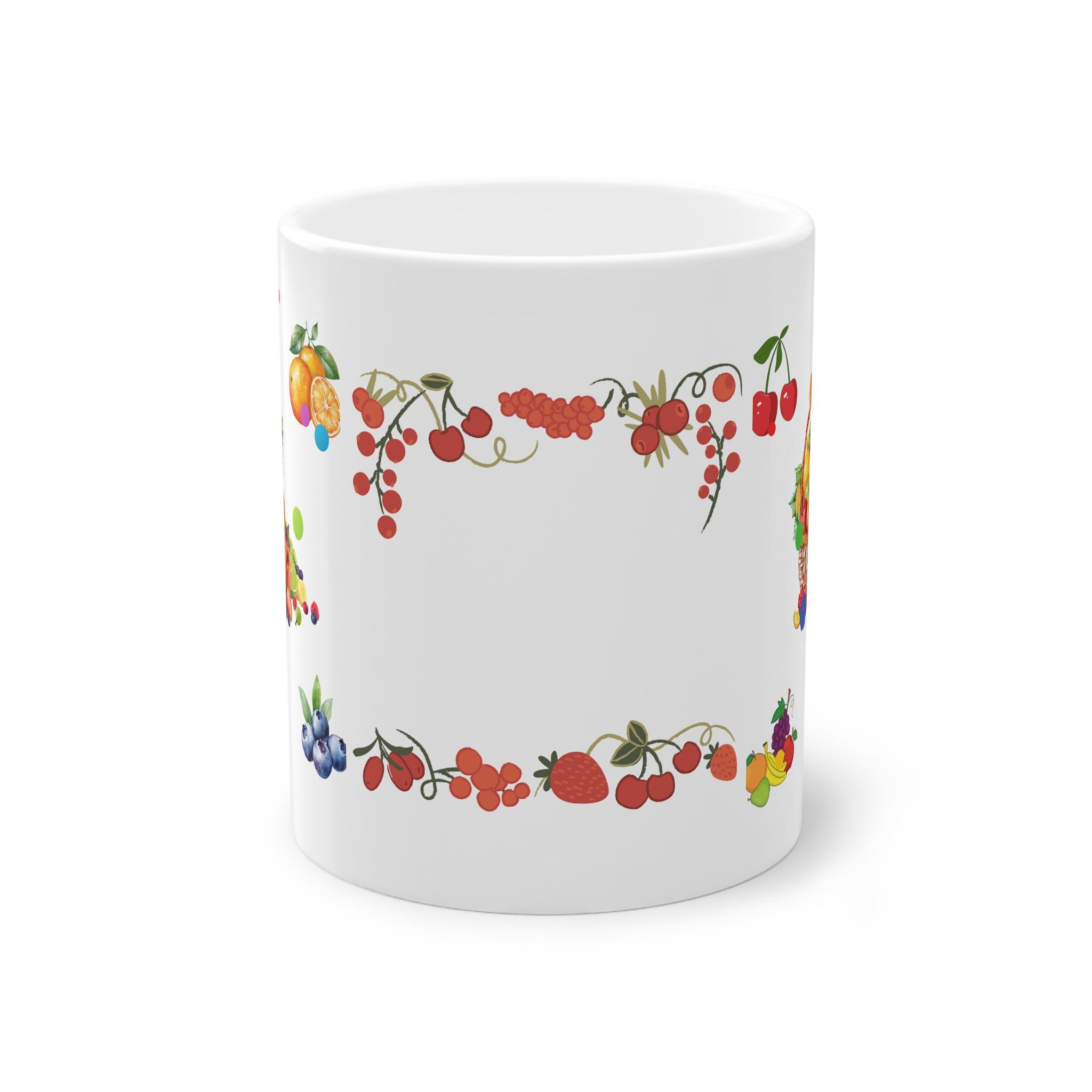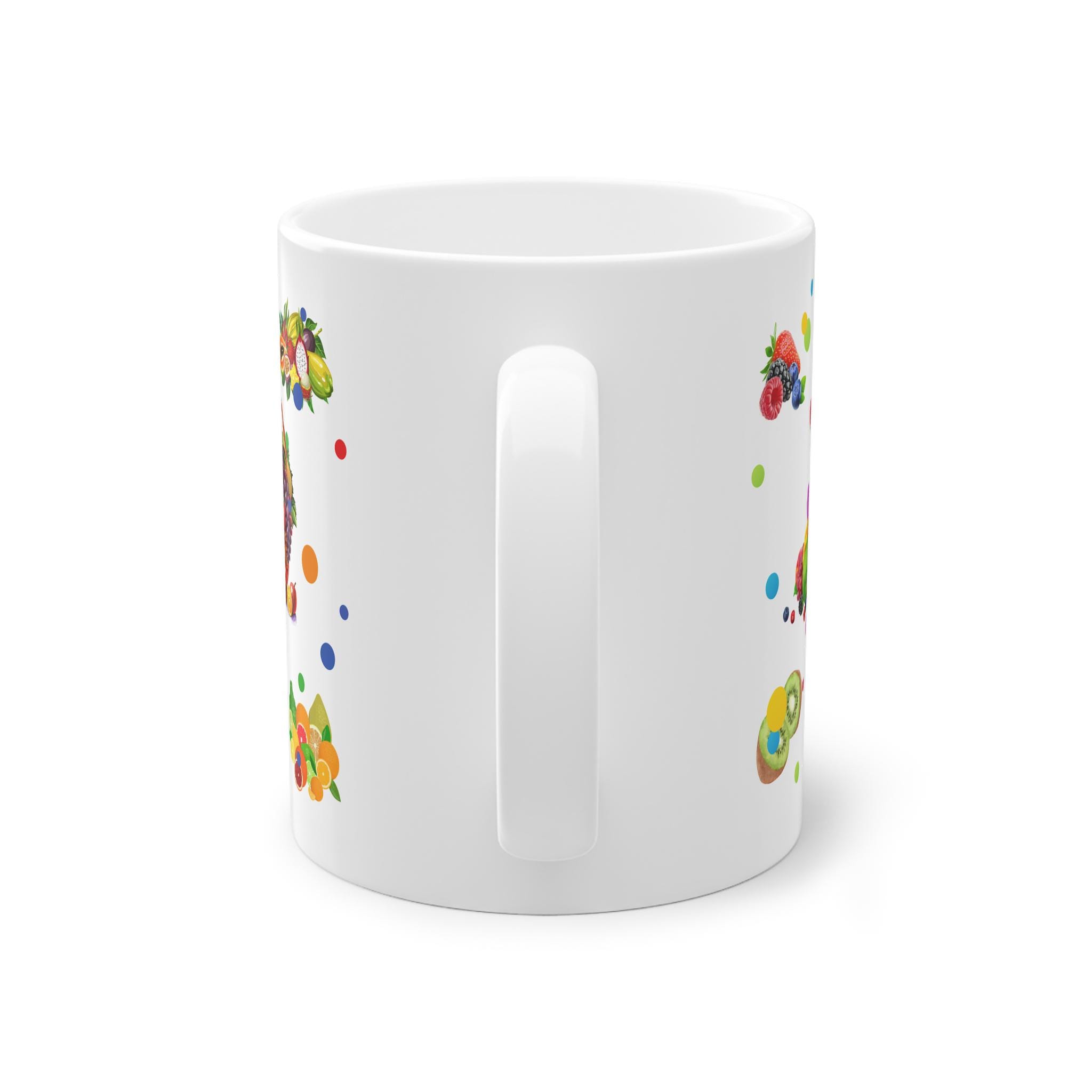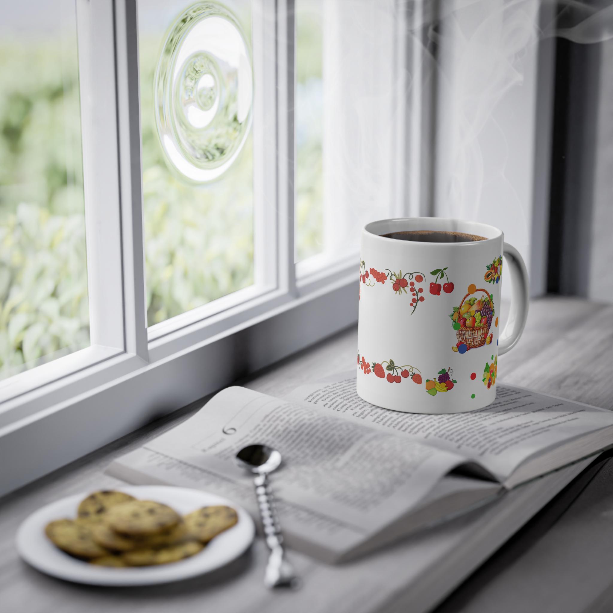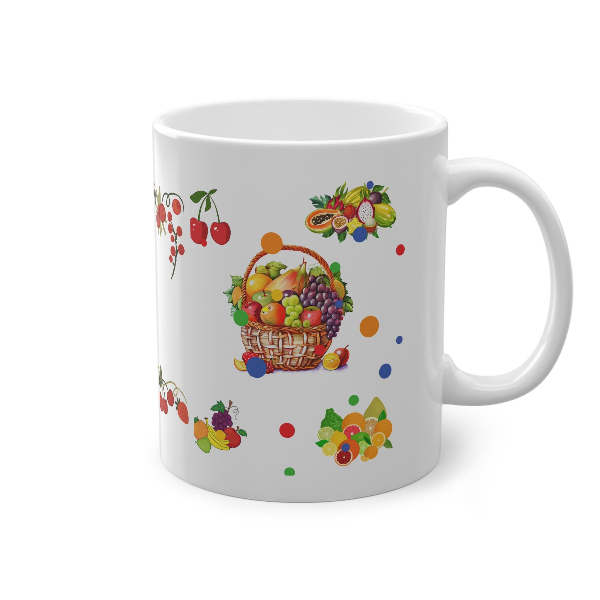 White mug with handle and fruit motifs for coffee and tea lovers. This mug exudes a cozy and inviting atmosphere, perfect for enjoying a hot drink on a relaxing day. Ideal for anyone who appreciates cute and colorful designs. Suitable for coffee or tea enthusiasts, perfect for casual get-togethers or quiet mornings at home.