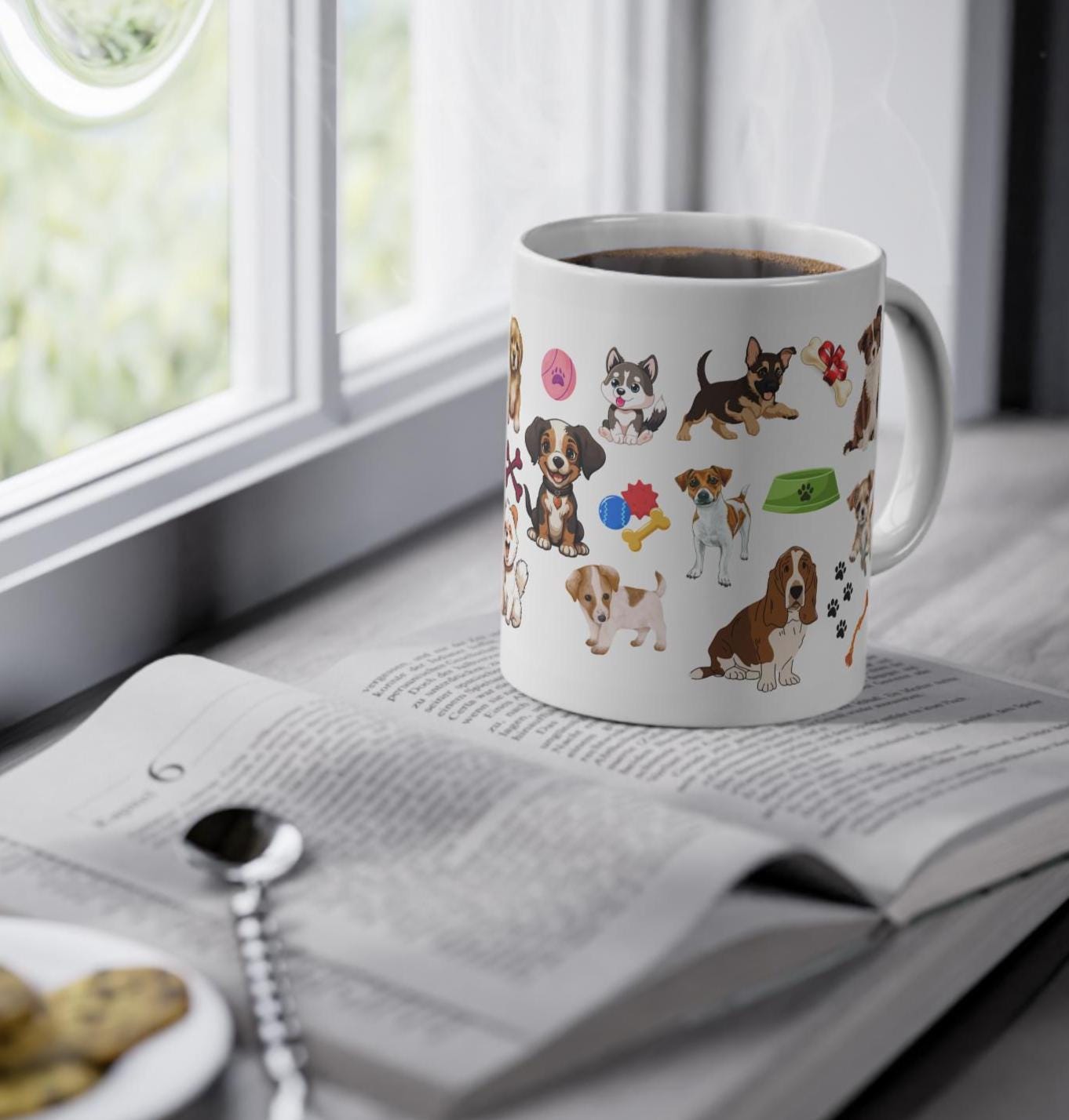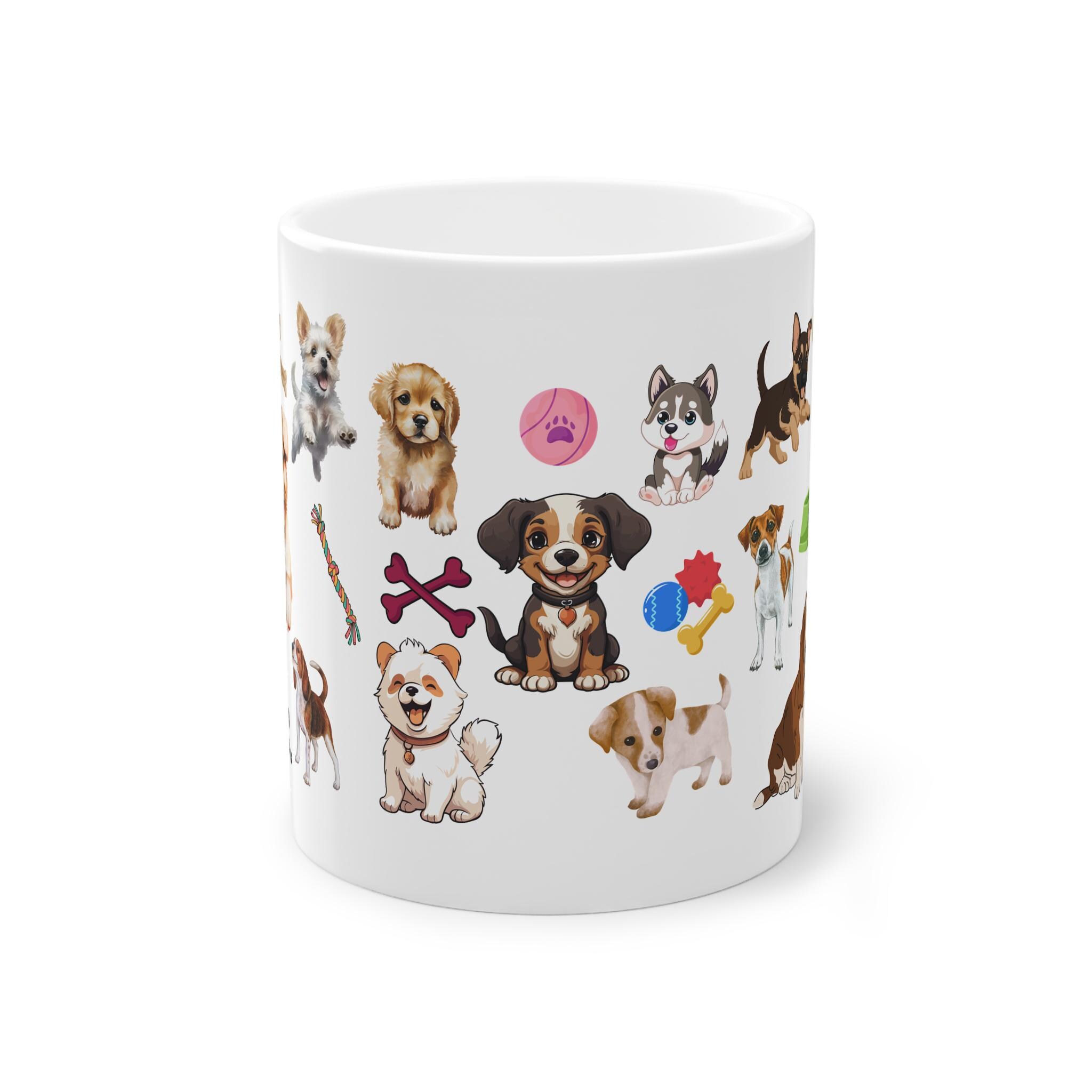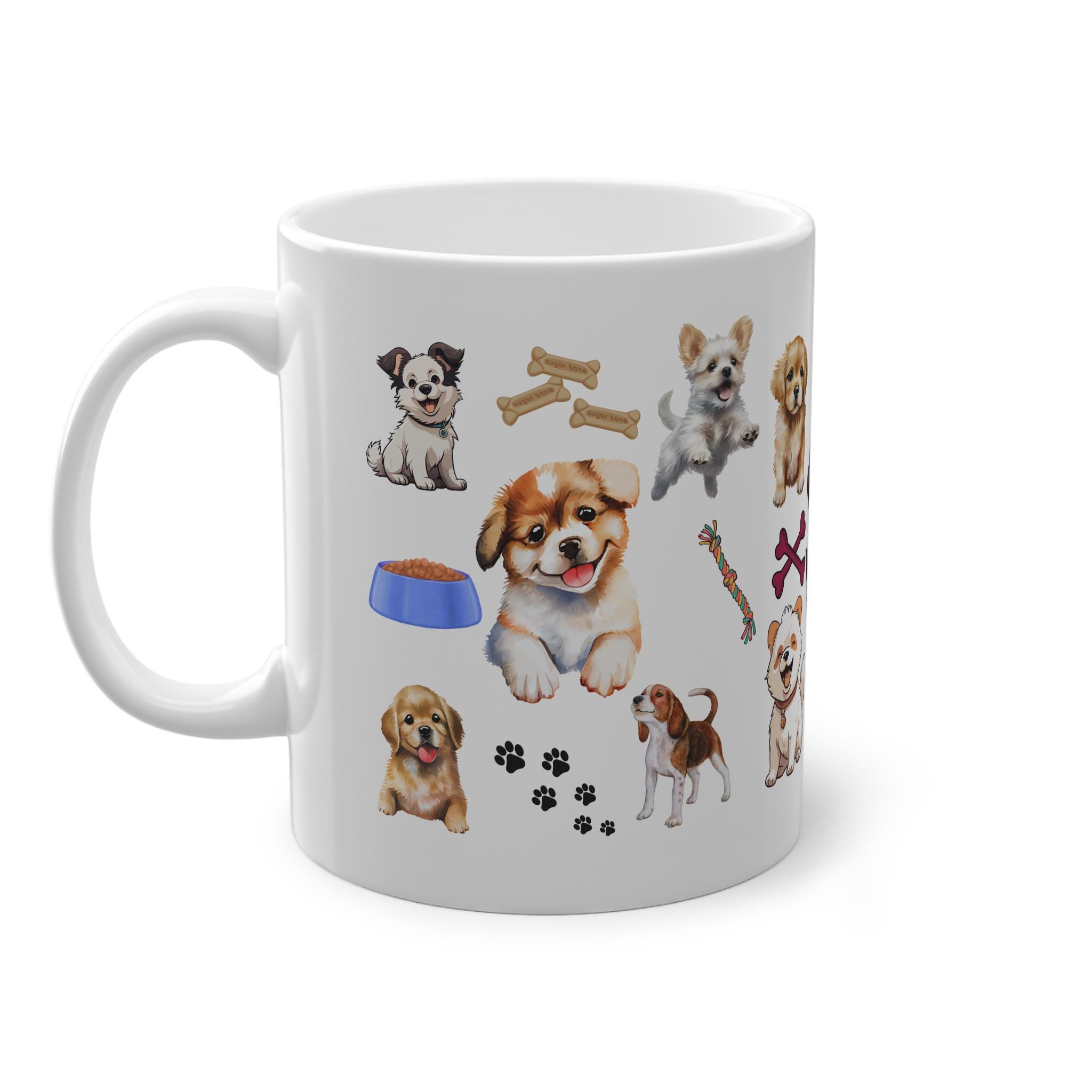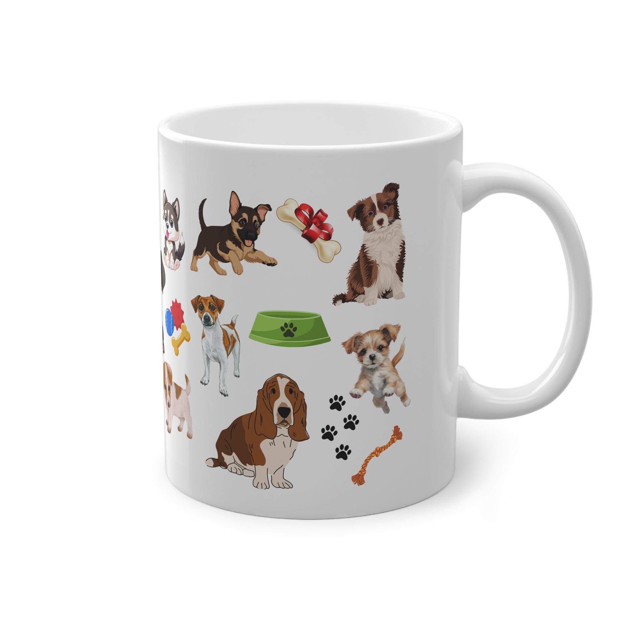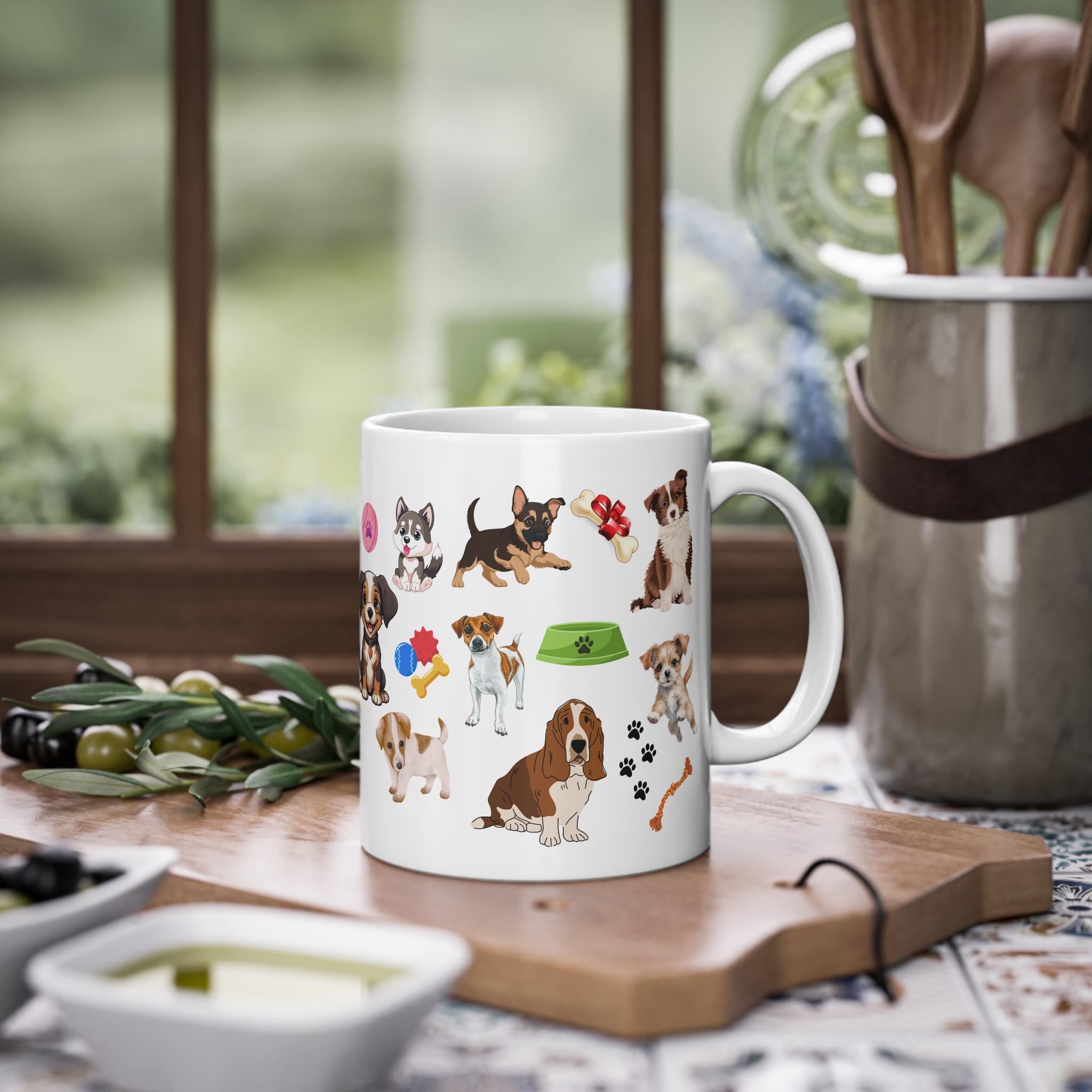 A ceramic mug featuring cute puppies of various dog breeds. The "Puppy Mug" is both fun and educational. It makes a witty gift for adults, children, friends, and dog lovers.