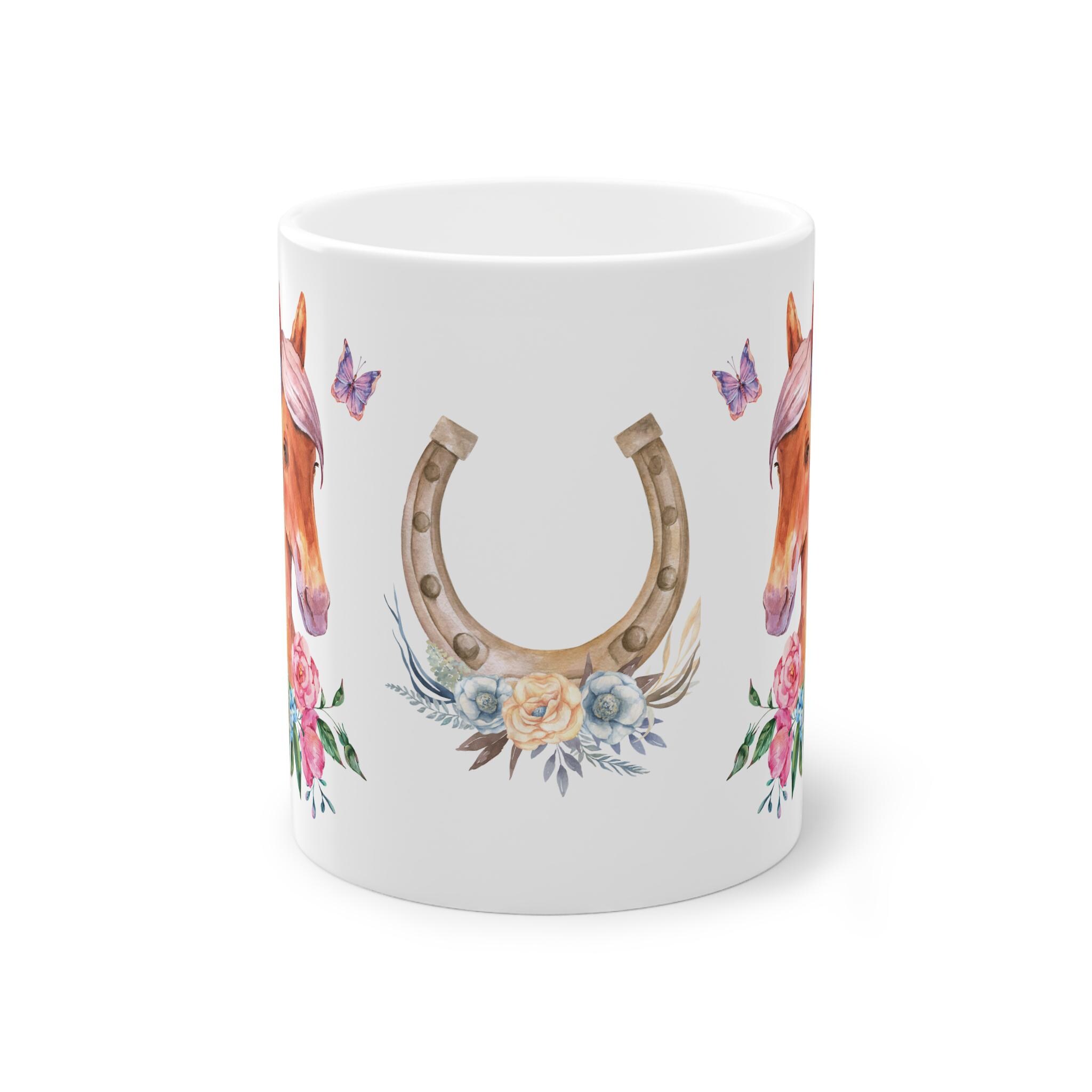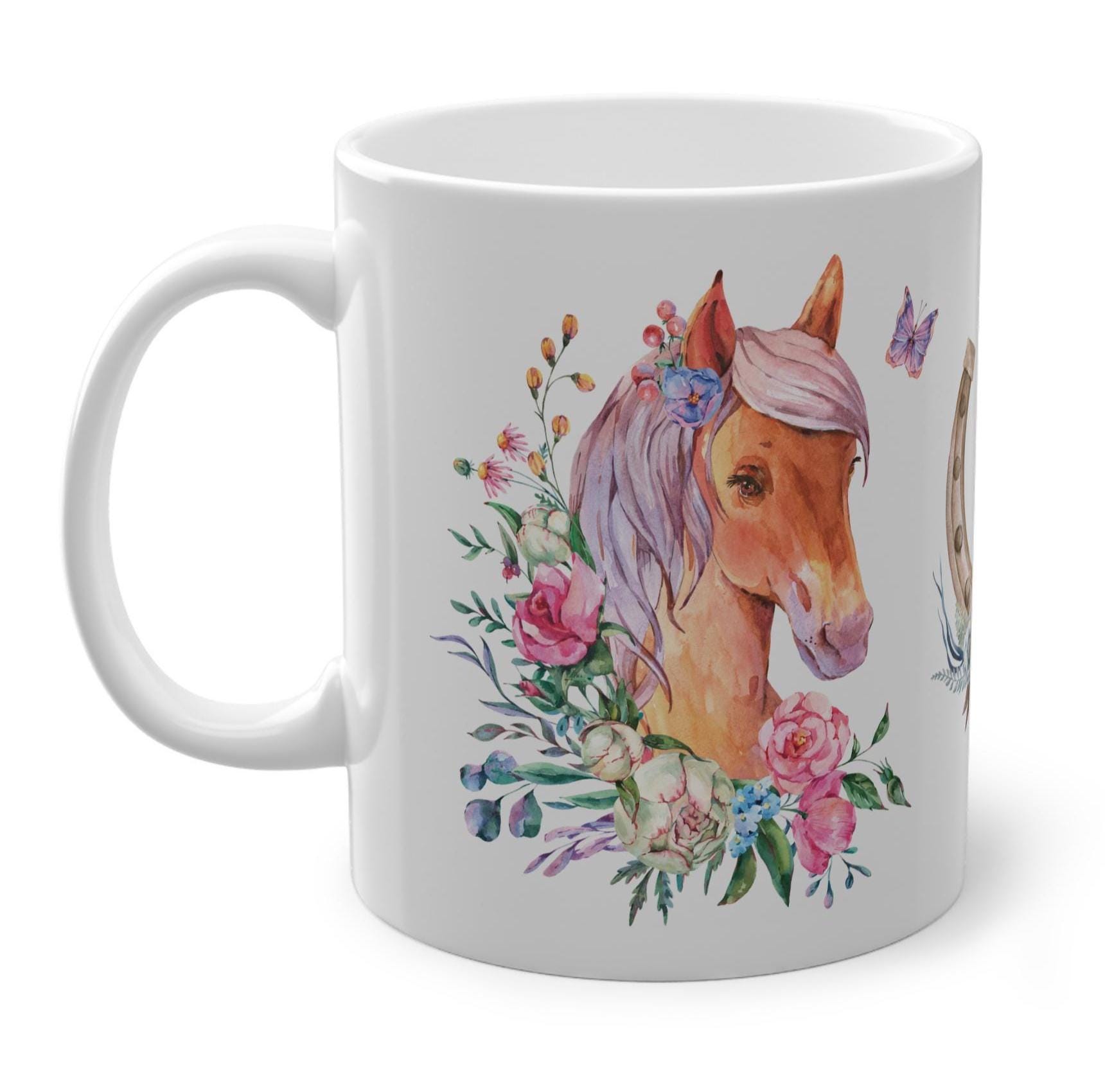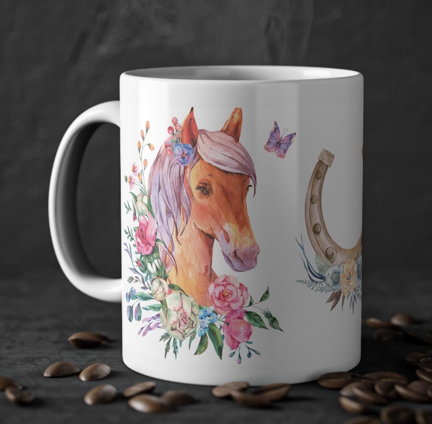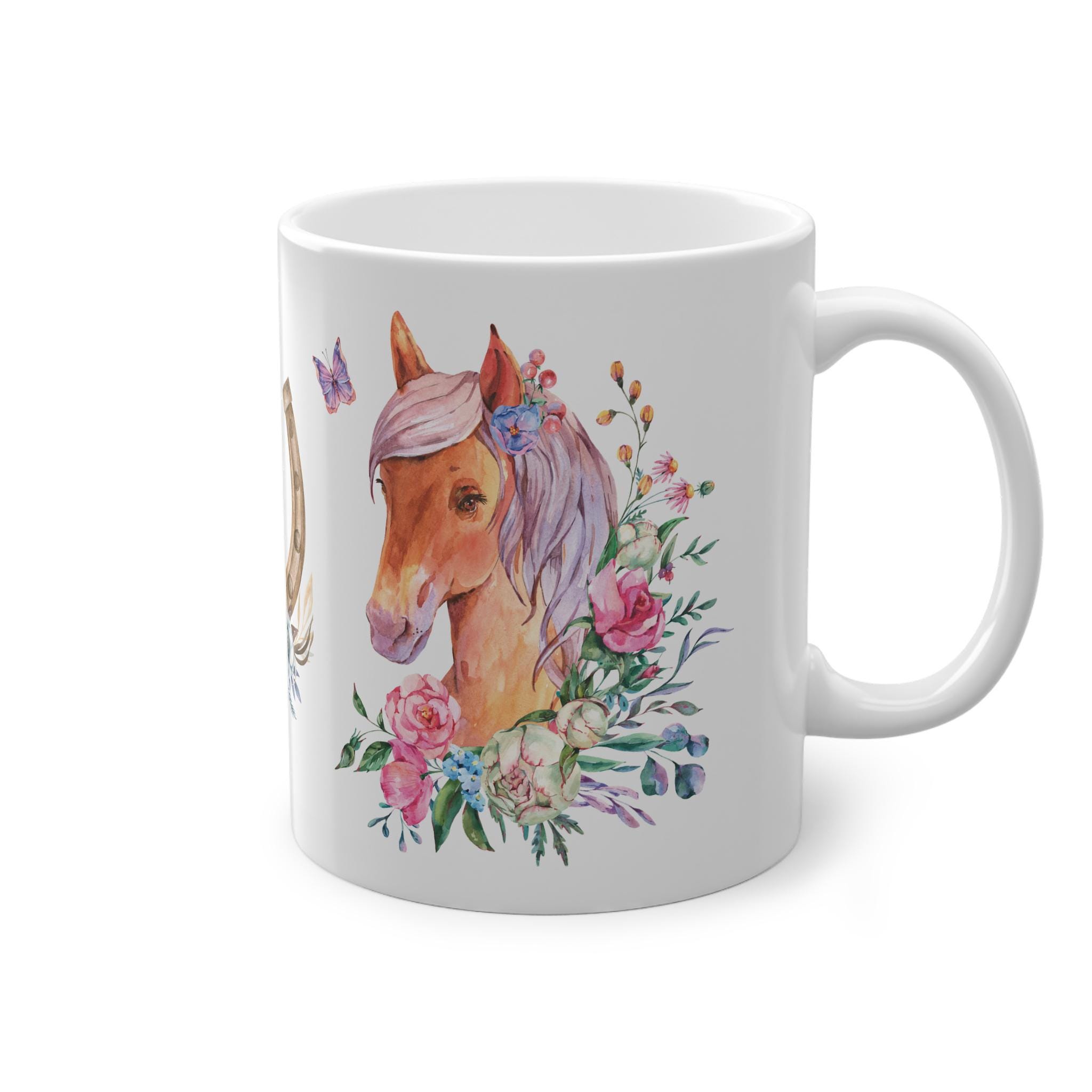 Horse mug, ceramic lucky charm 330ml mug for girls and horse lovers, horseshoe motif, colorful, gift idea, birthday, school enrollment