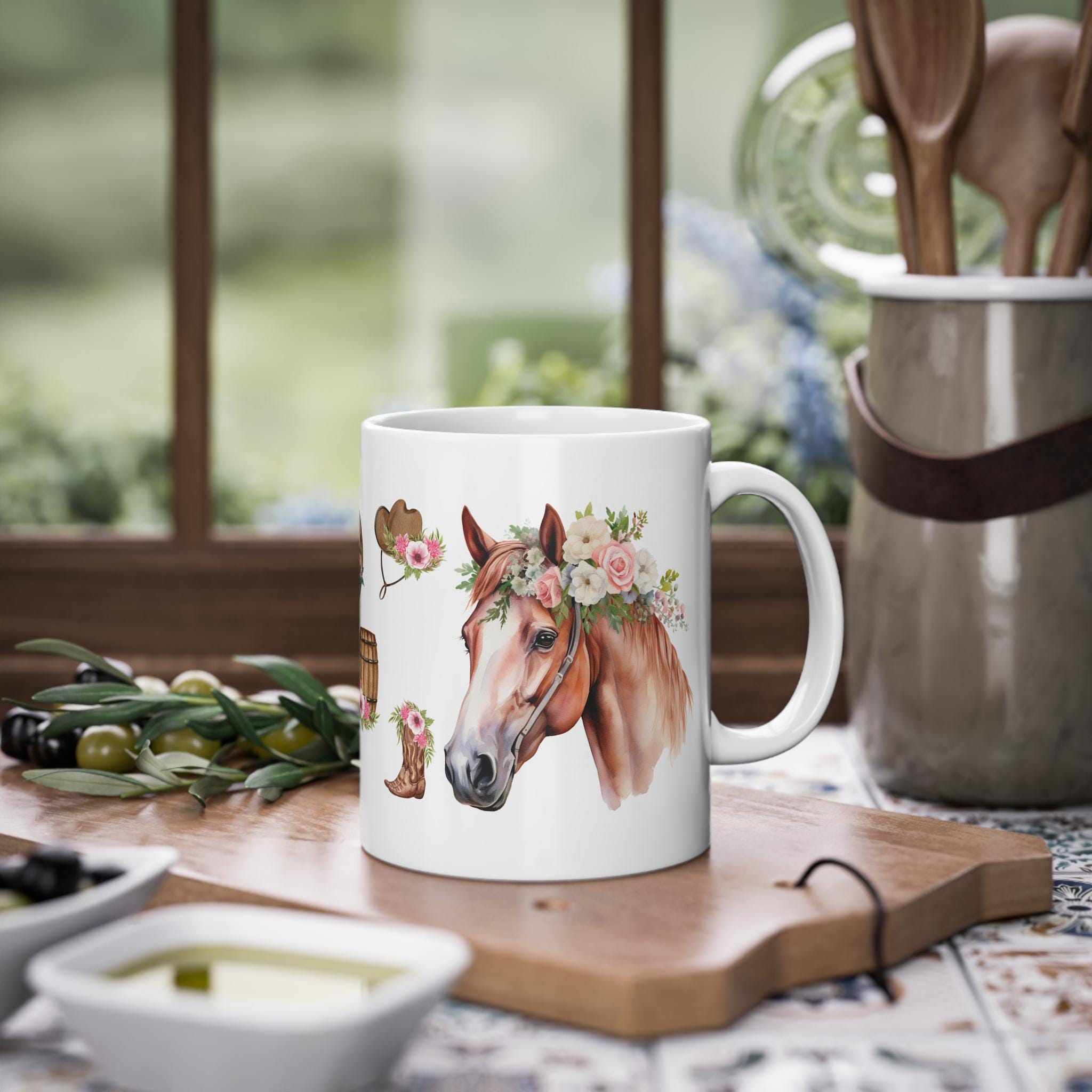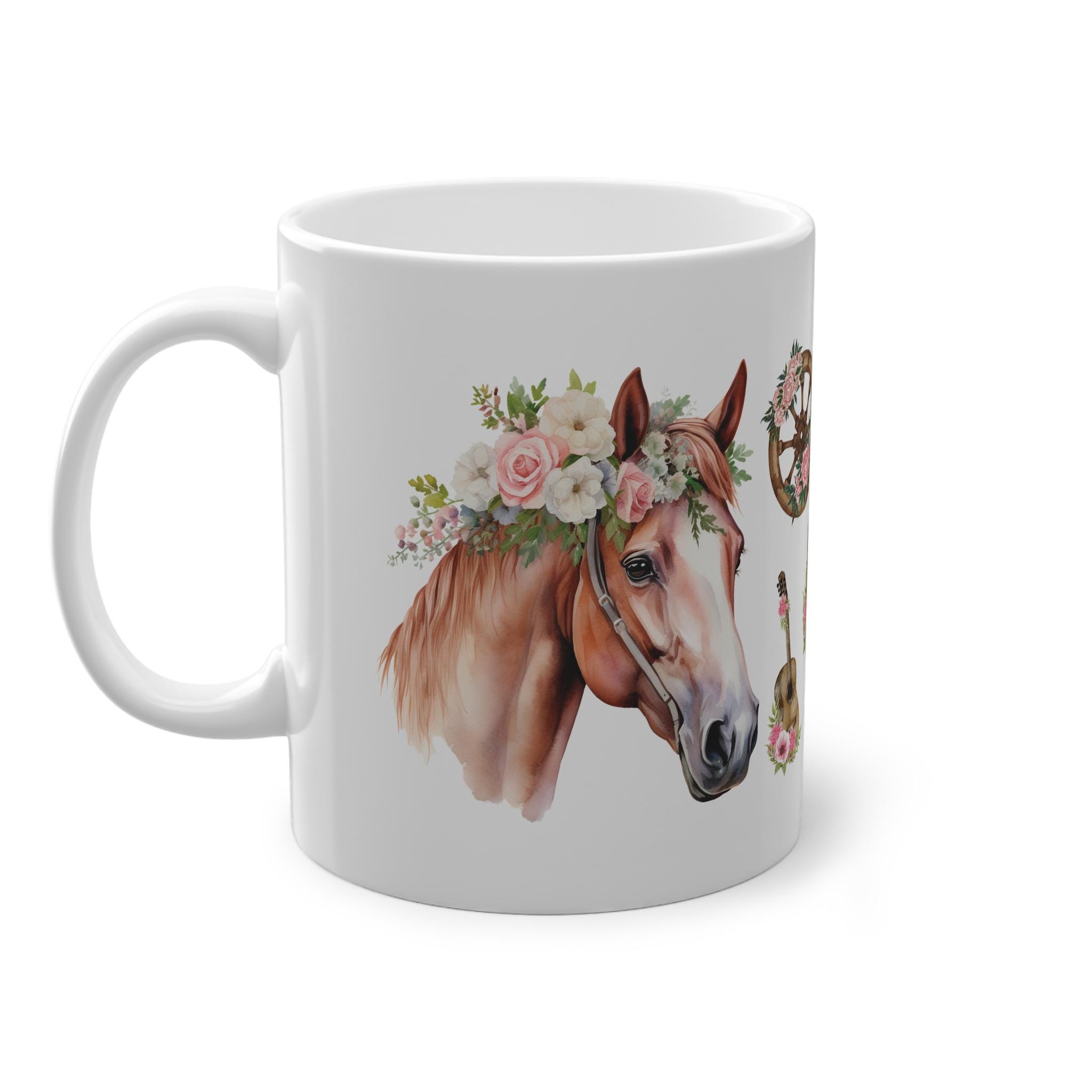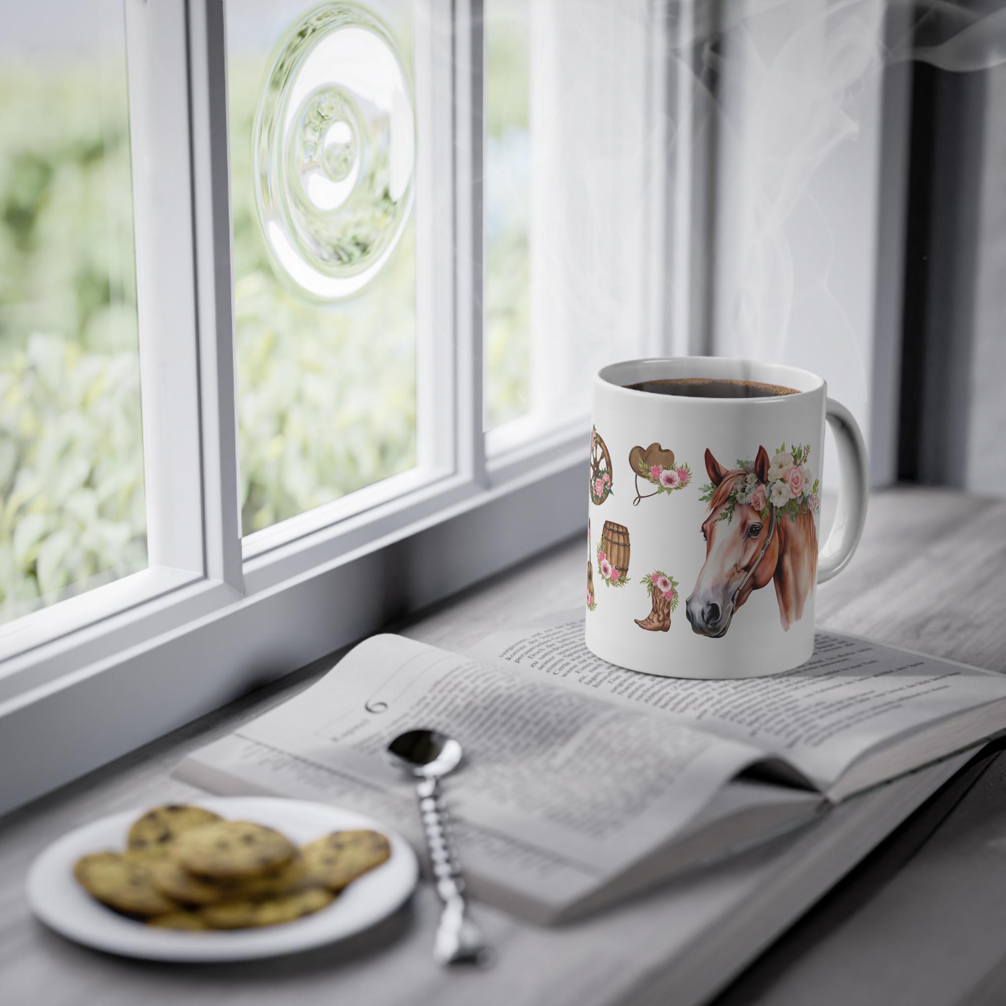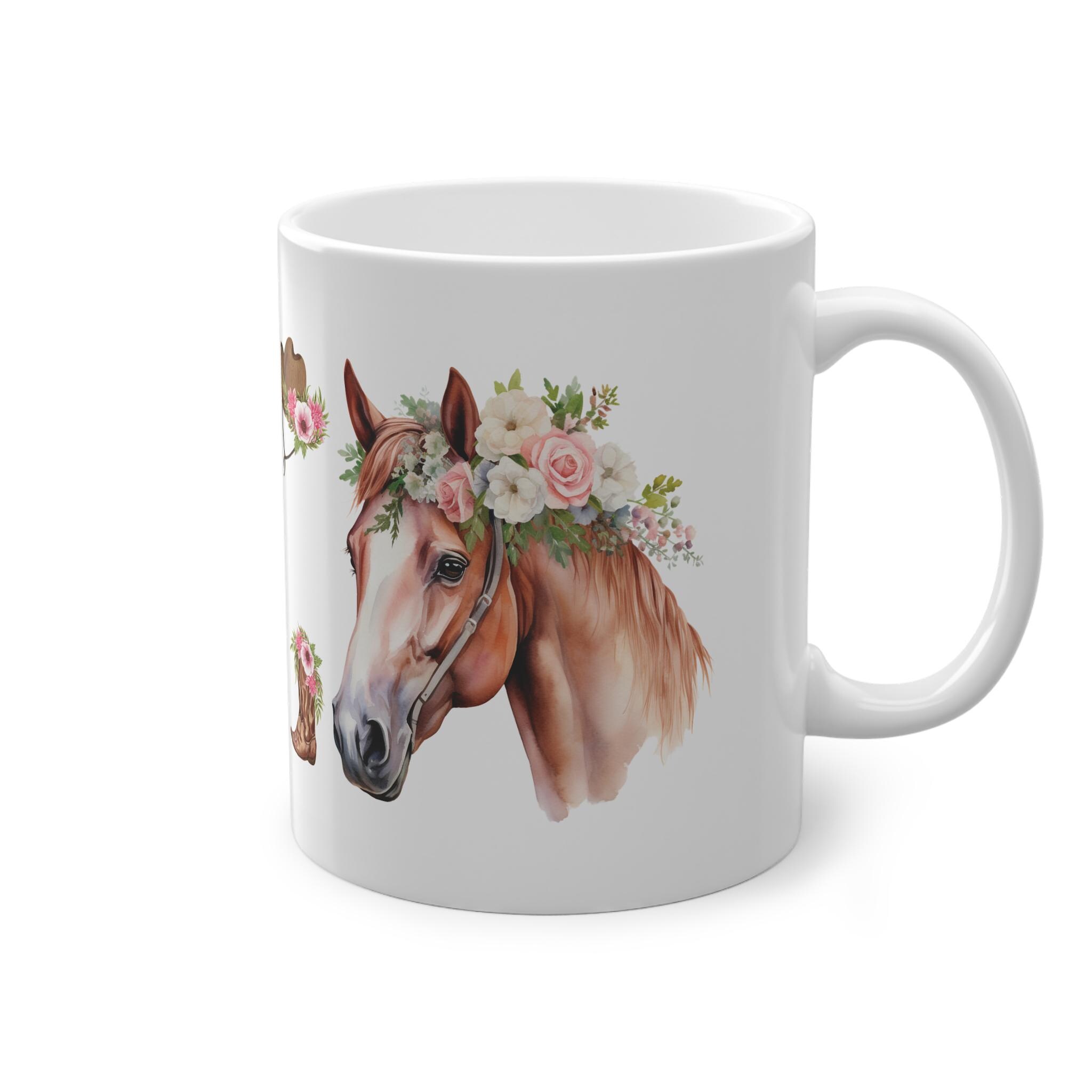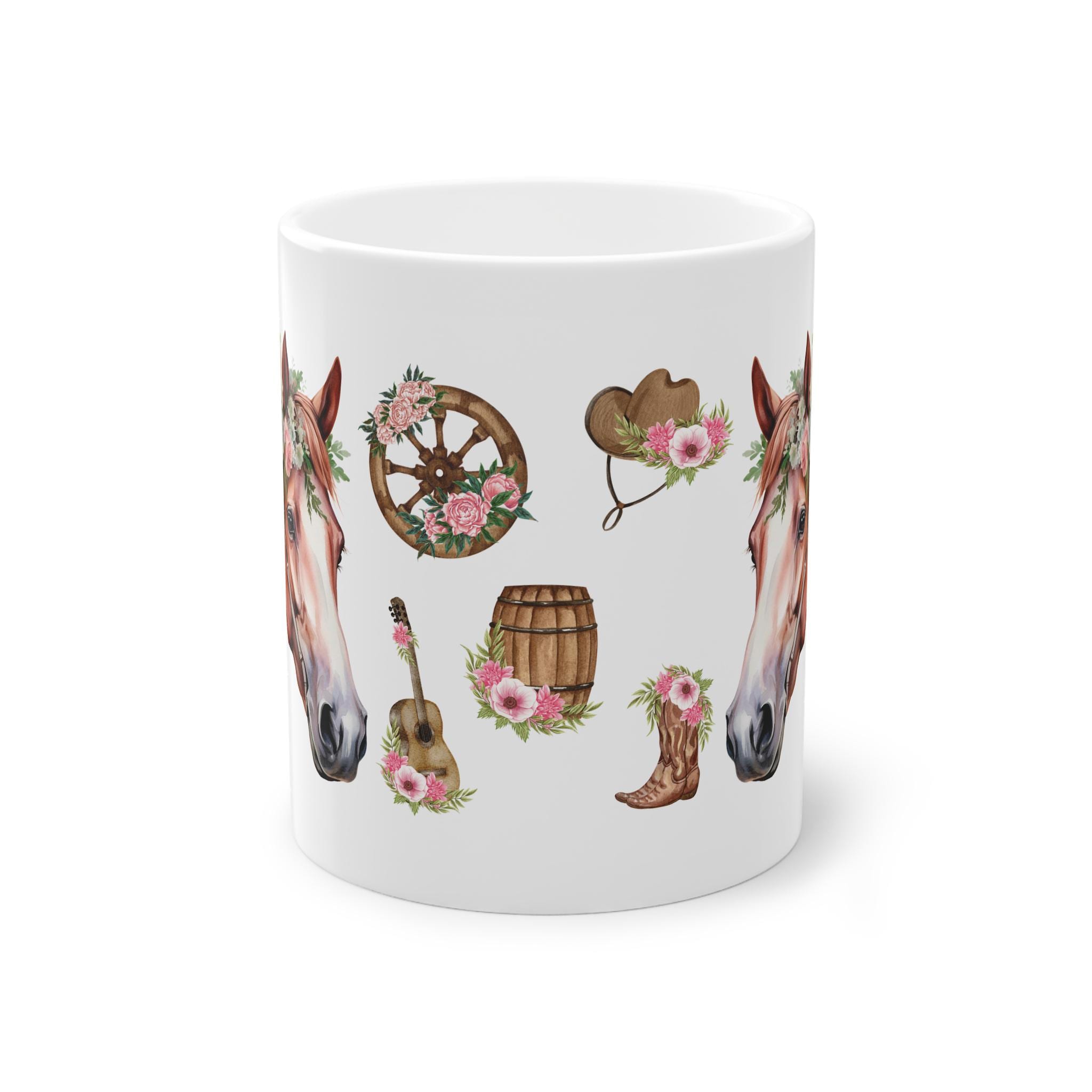 This high-quality coffee mug features a beautiful horse with floral details and rustic charm. Ideal for morning coffee, tea, or hot chocolate.
