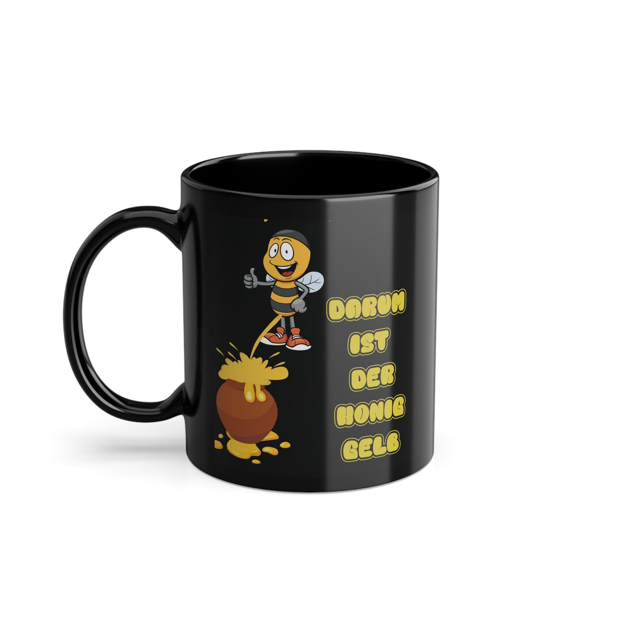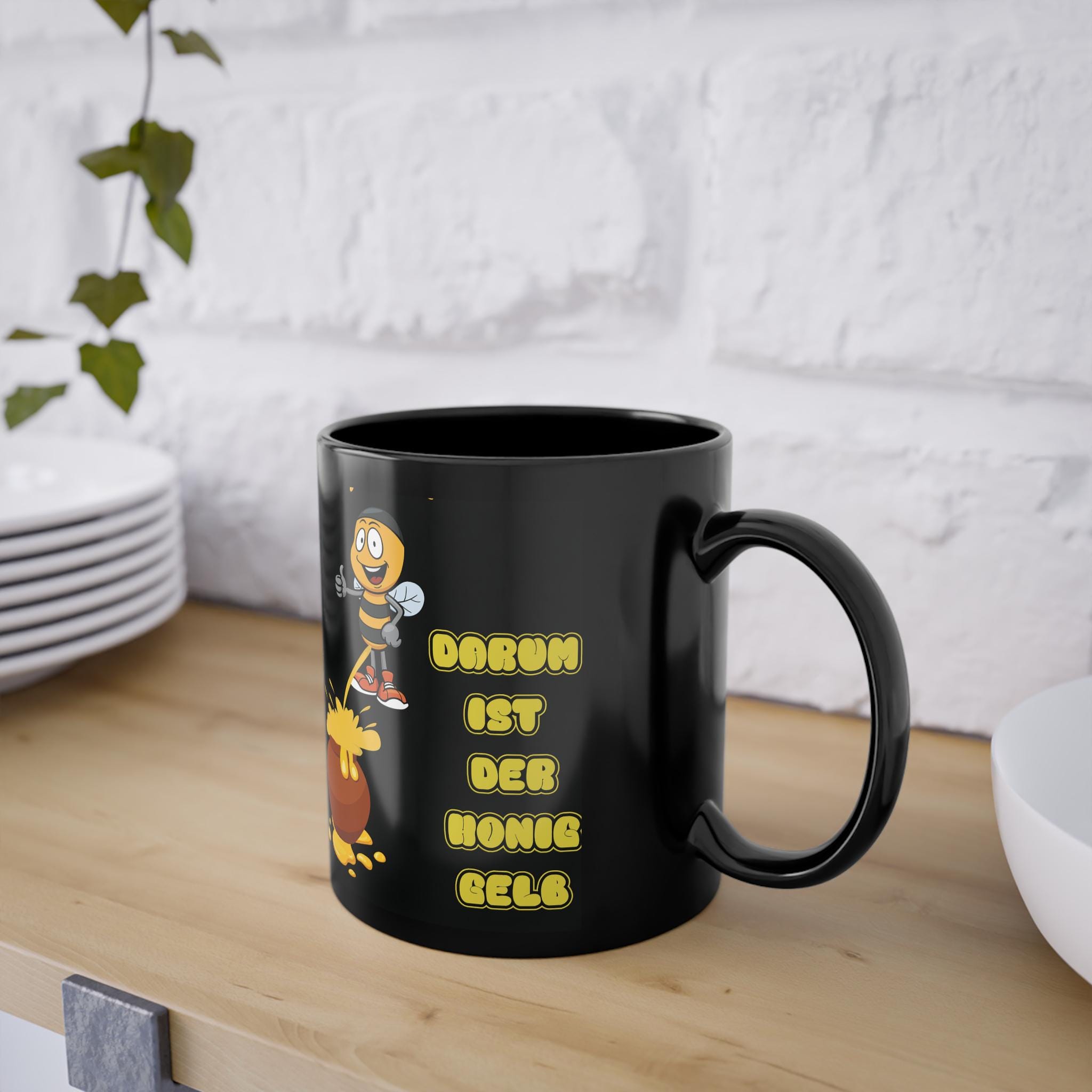 This glossy black coffee mug not only adds color to your morning, but also a real sense of humor! Printed with a cheeky bee peeing in a honey pot and the saying "That's why honey is yellow," it's guaranteed to bring laughter to the breakfast table or office.