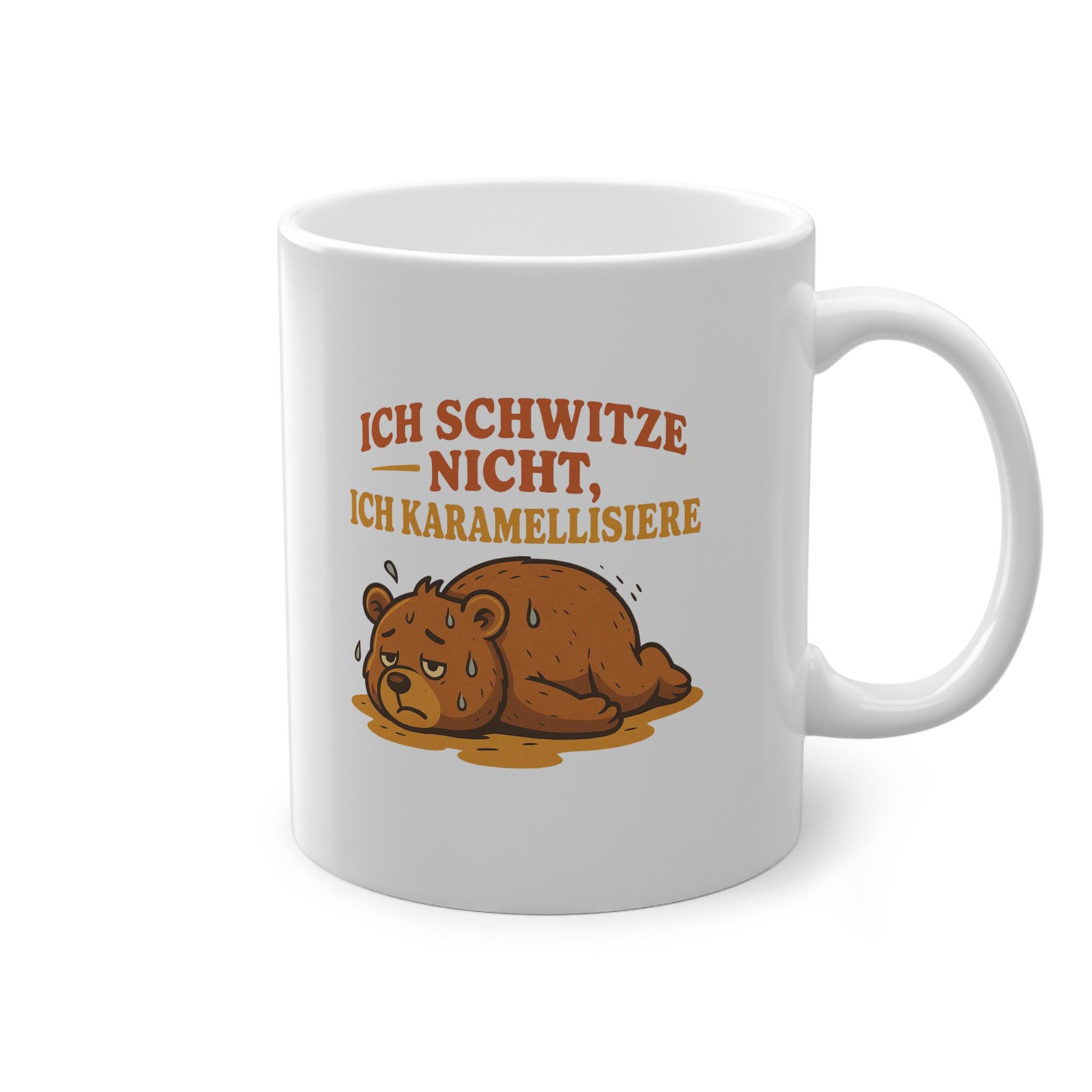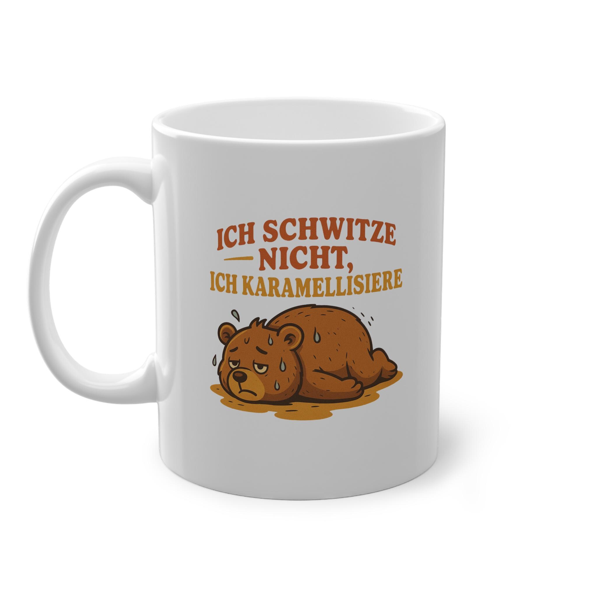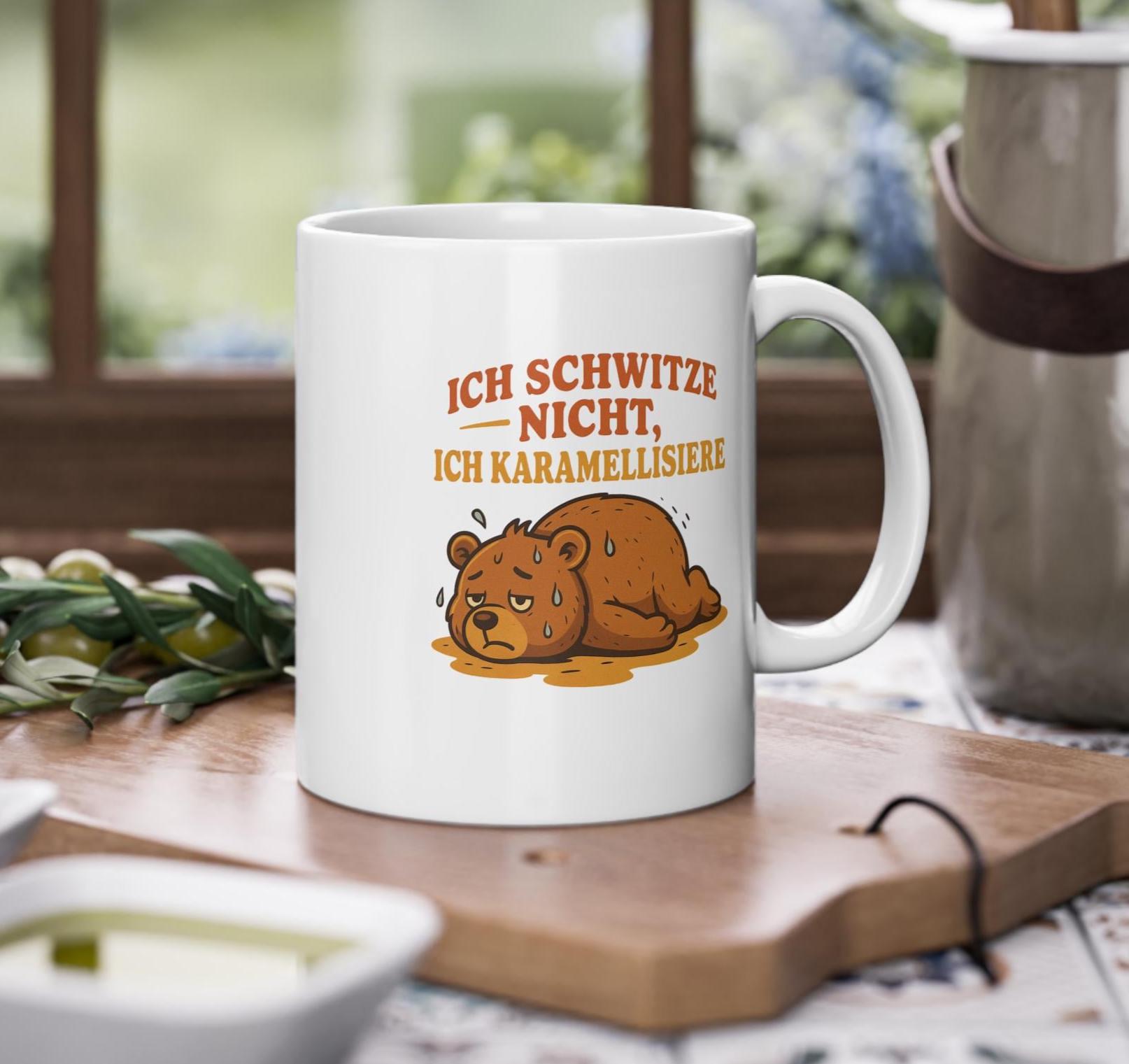 Mug with animal motif of a sweating bear – "I don't sweat, I caramelize," fitting for the weather. 🫠🫠