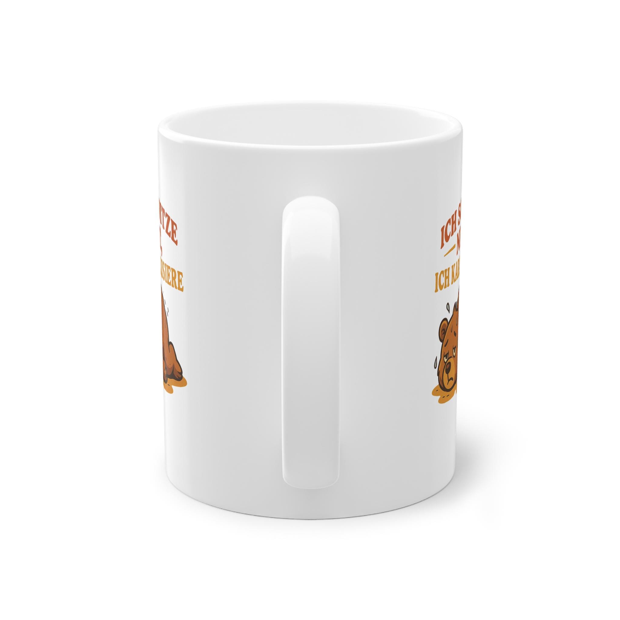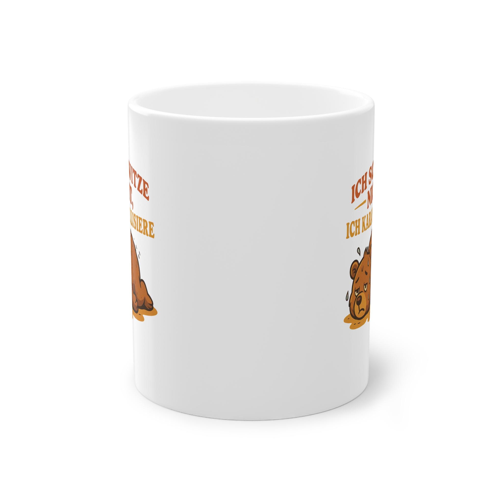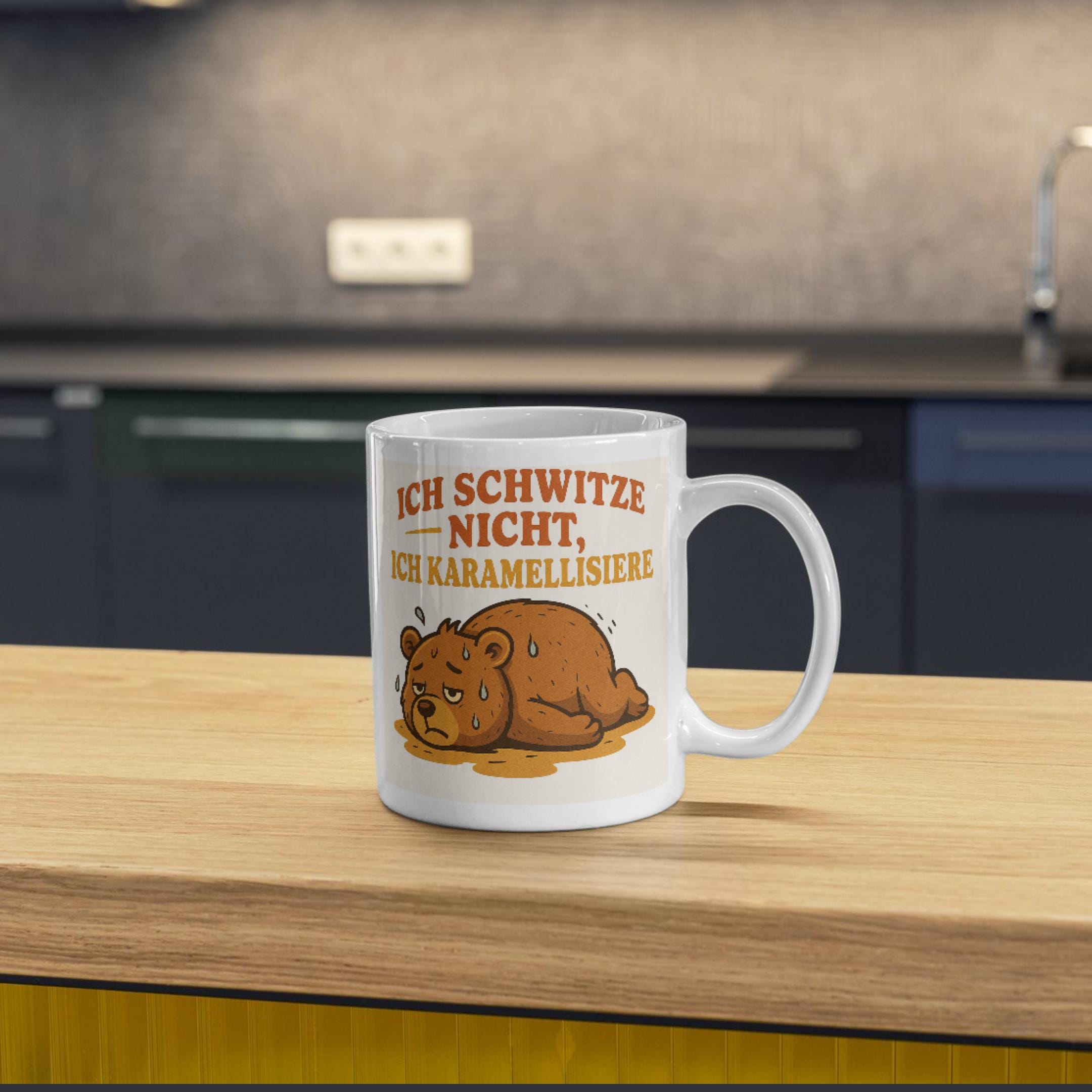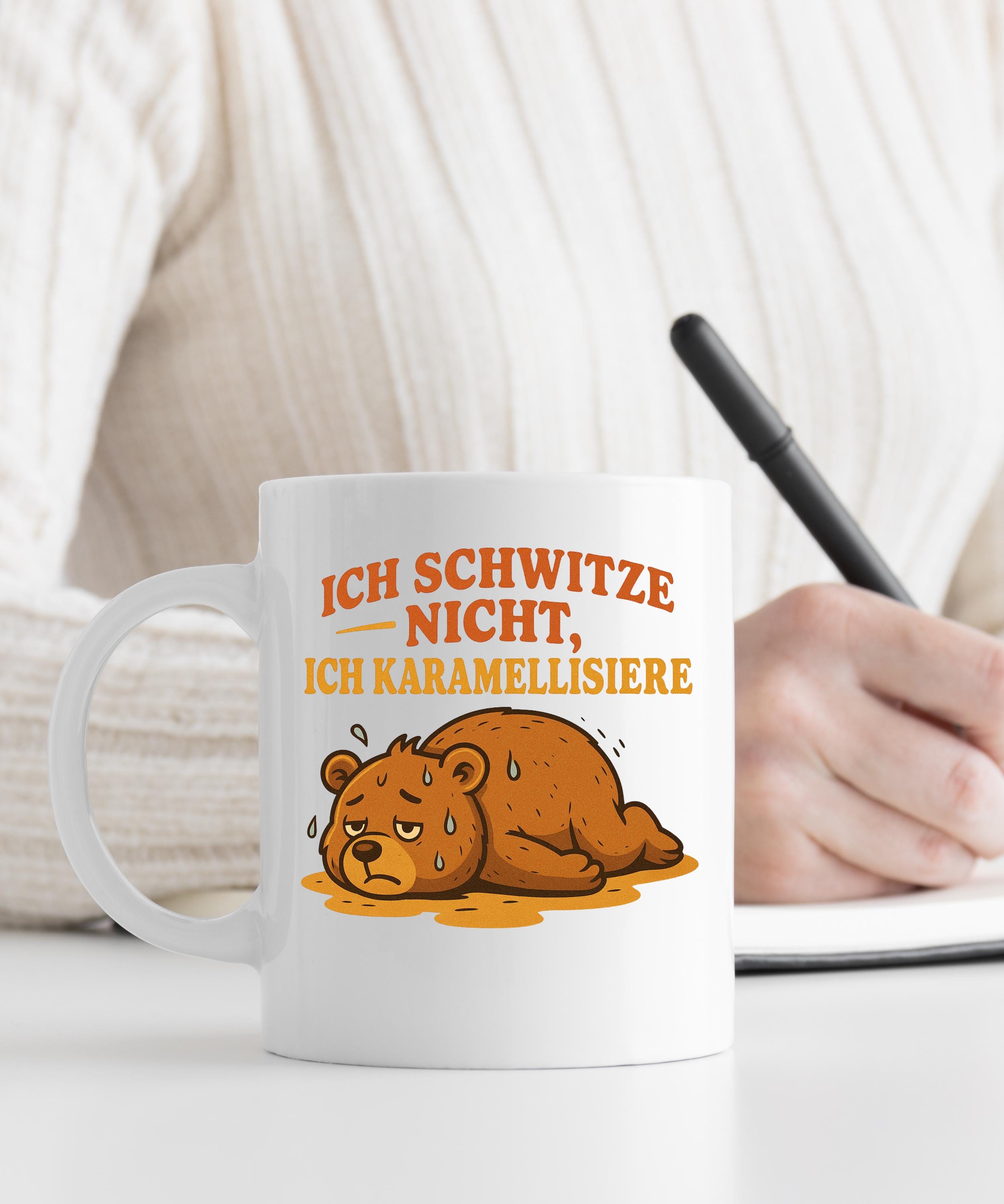 Mug with animal motif of a sweating bear – "I don't sweat, I caramelize," fitting for the weather. 🫠🫠