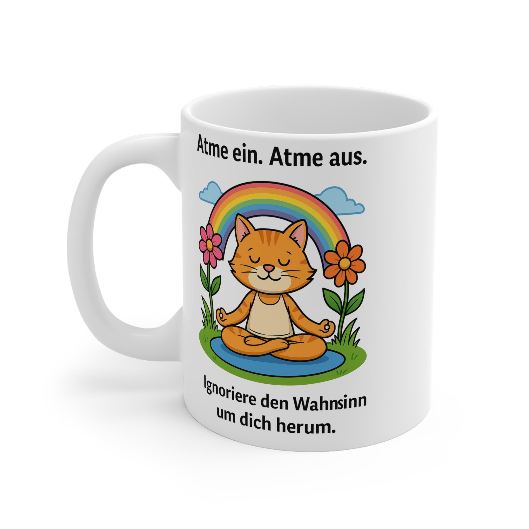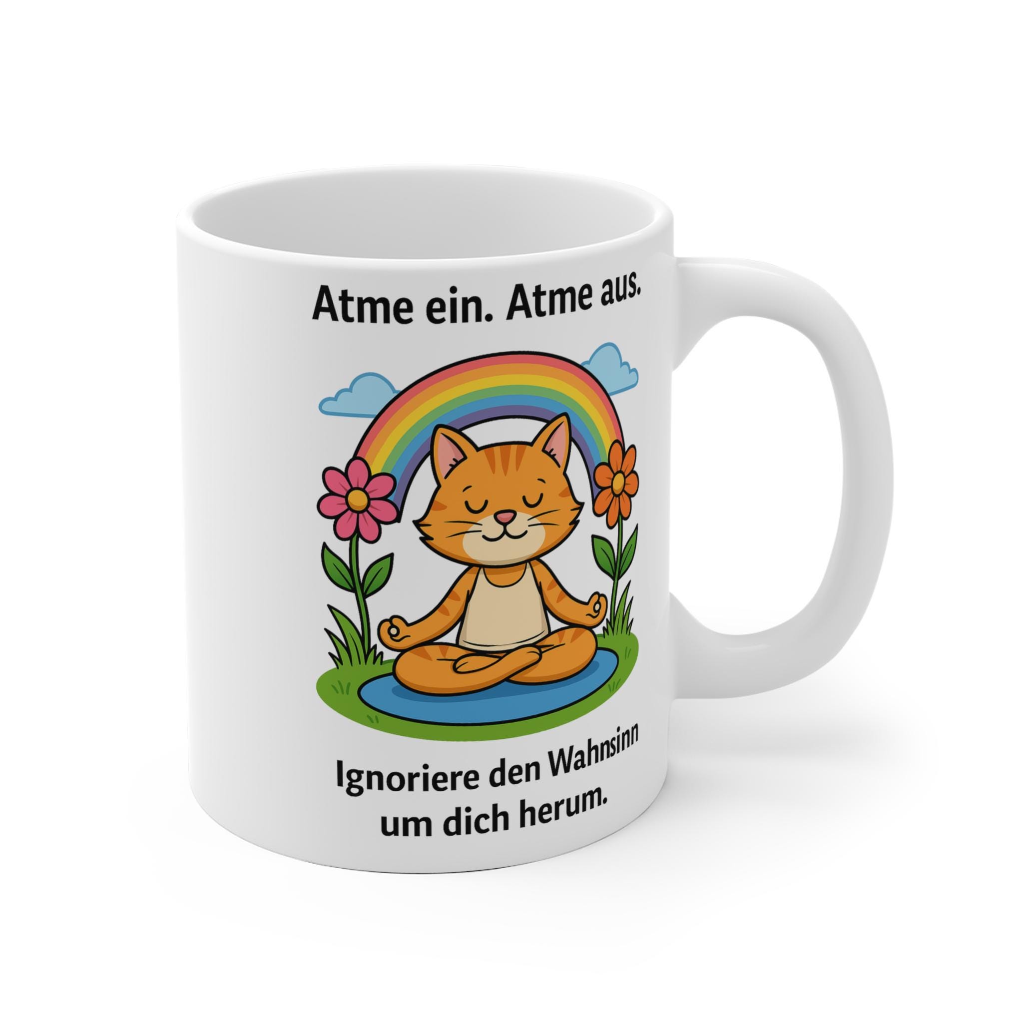 This lovingly designed yoga mug featuring a cute, meditating cat brings calm, mindfulness, and a smile to every day. The saying "Breathe in. Breathe out. Ignore the madness around you" adds humor to your morning coffee or tea and is a real eye-catcher in the office or at home.