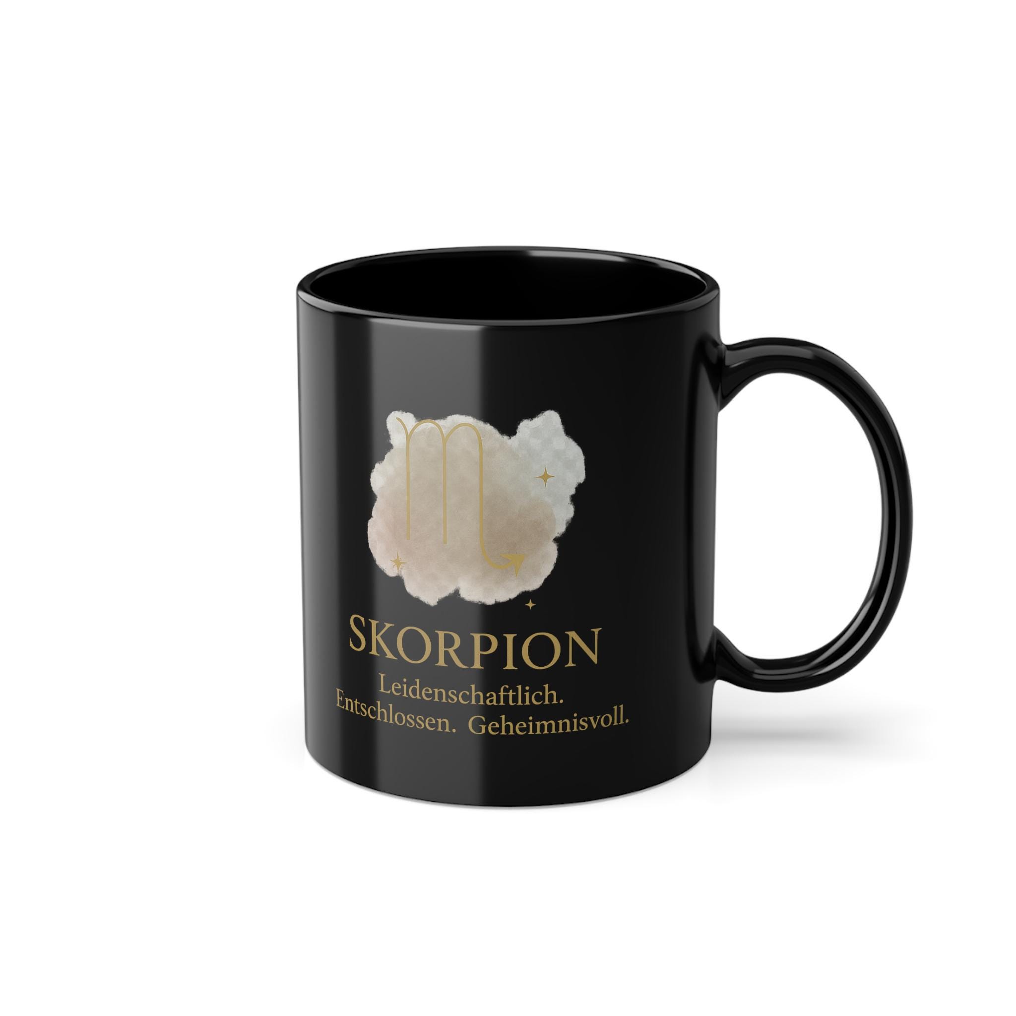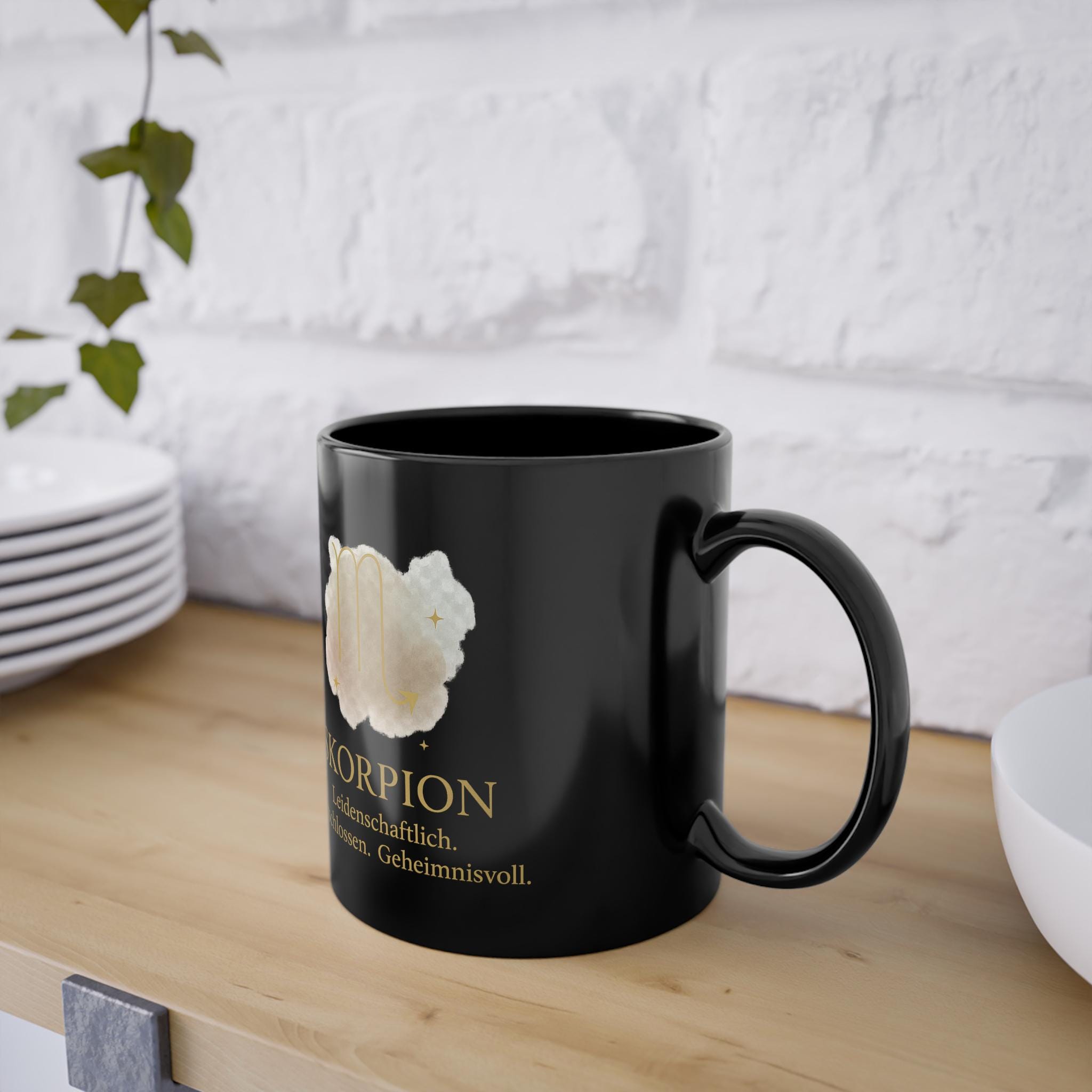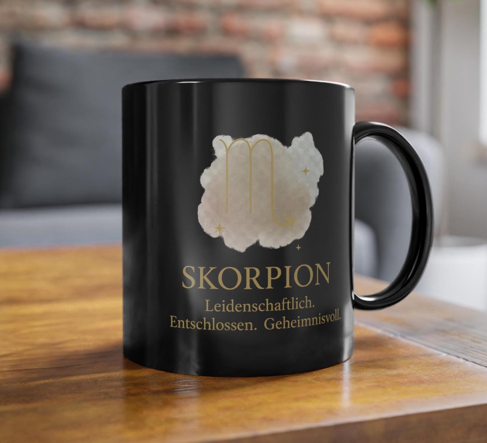 Black ceramic mug featuring the Scorpio zodiac sign in gold lettering – perfect for astrology fans. Ideal as a gift or for personal use. This mug exudes an elegant and mystical atmosphere. Ideal for astrology fans and anyone who appreciates personalized gifts. Ideal for birthdays, holidays, or other astrology-related occasions.