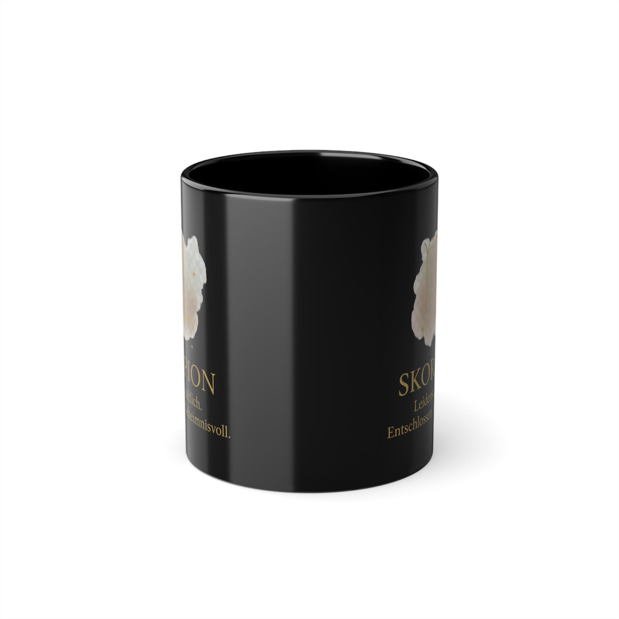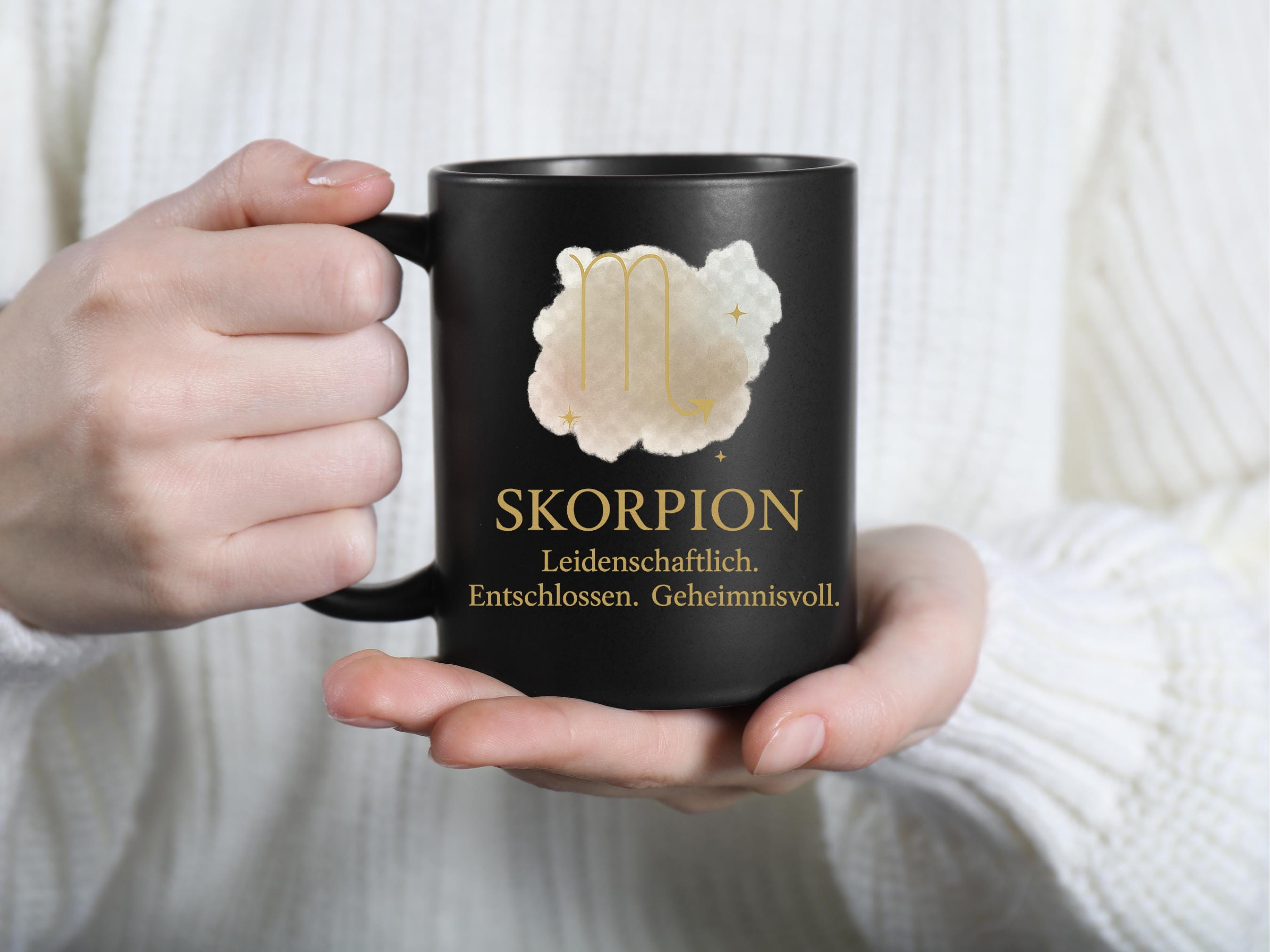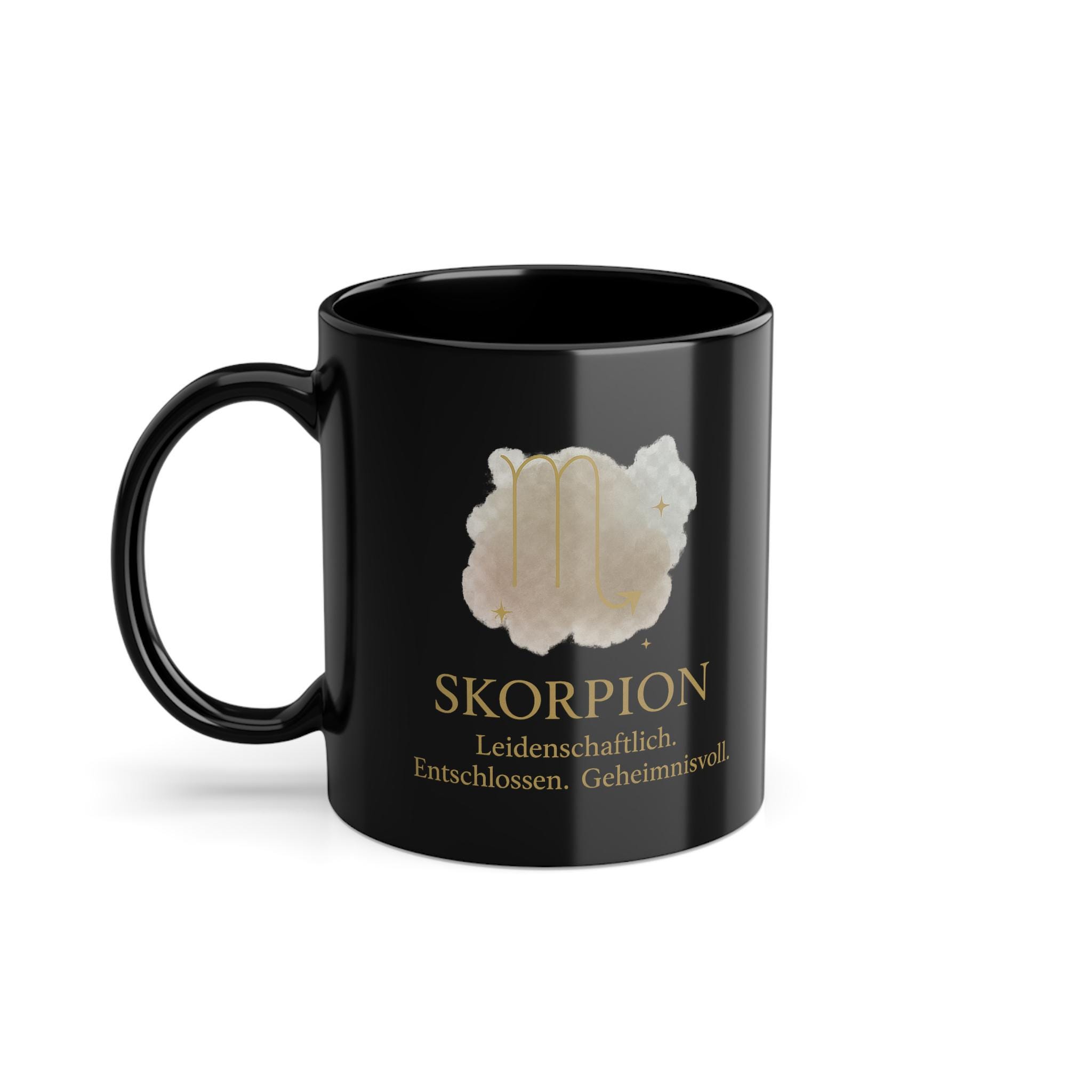 Black ceramic mug featuring the Scorpio zodiac sign in gold lettering – perfect for astrology fans. Ideal as a gift or for personal use. This mug exudes an elegant and mystical atmosphere. Ideal for astrology fans and anyone who appreciates personalized gifts. Ideal for birthdays, holidays, or other astrology-related occasions.