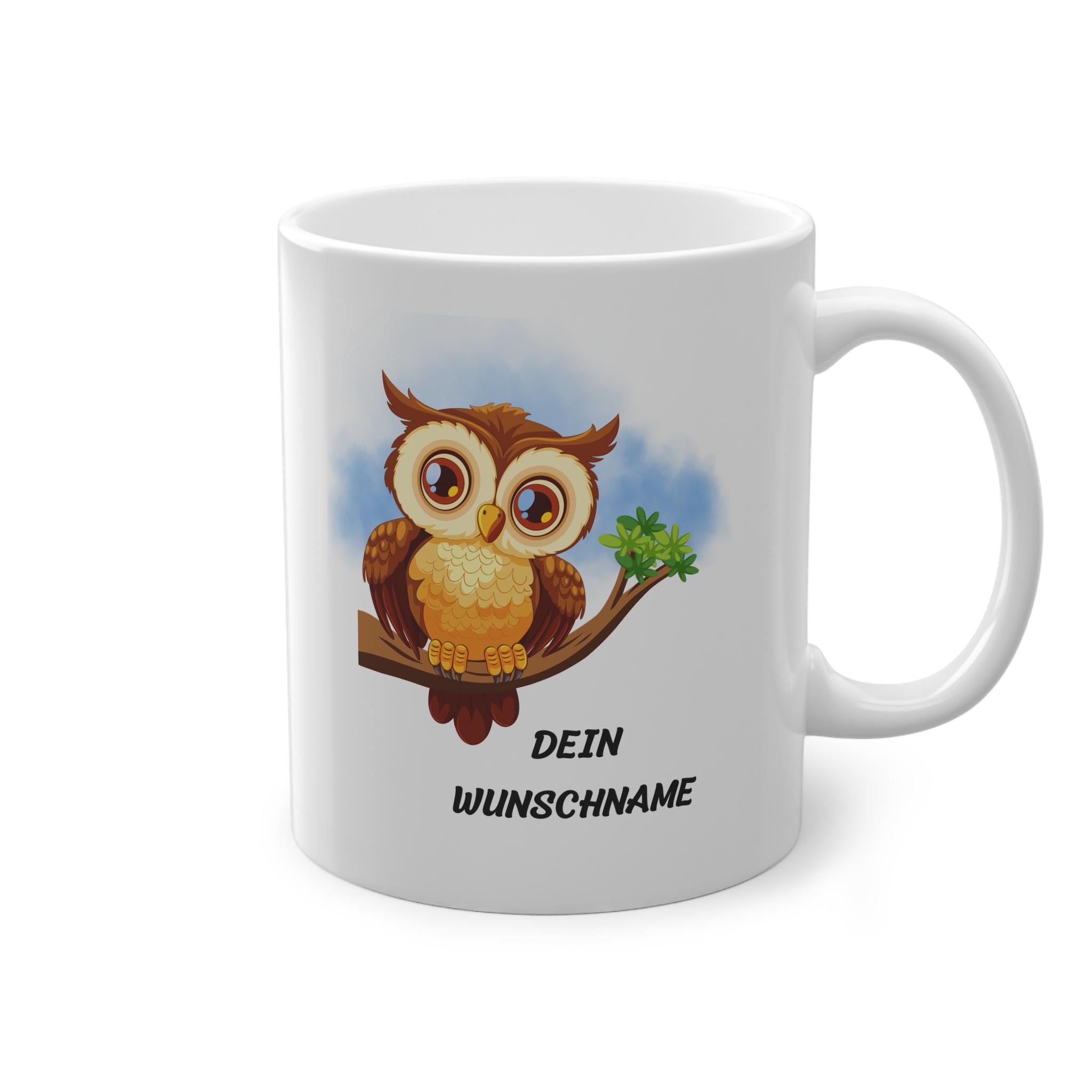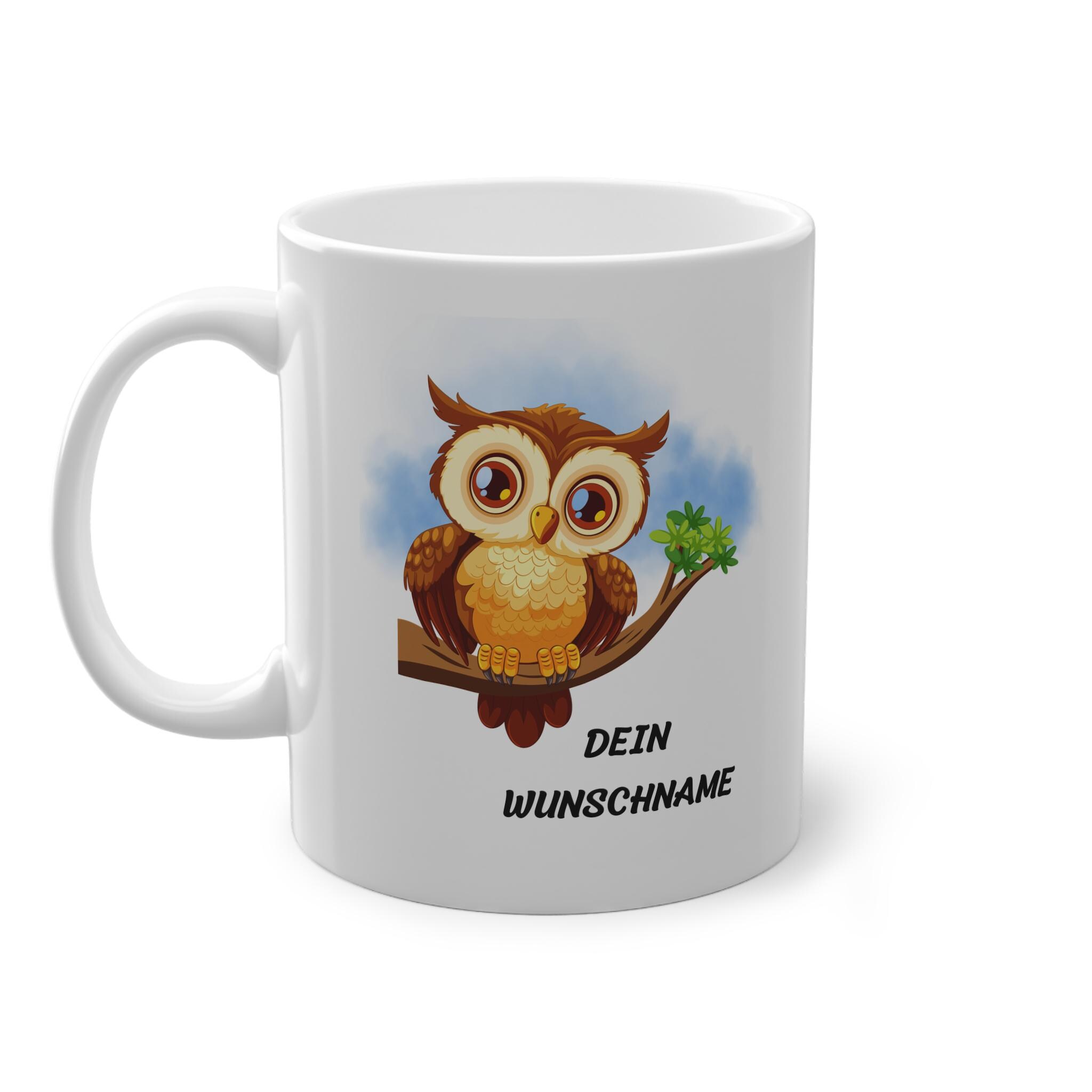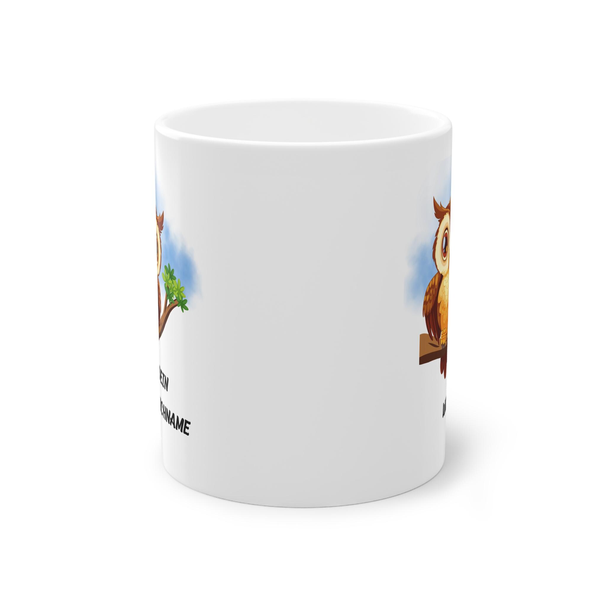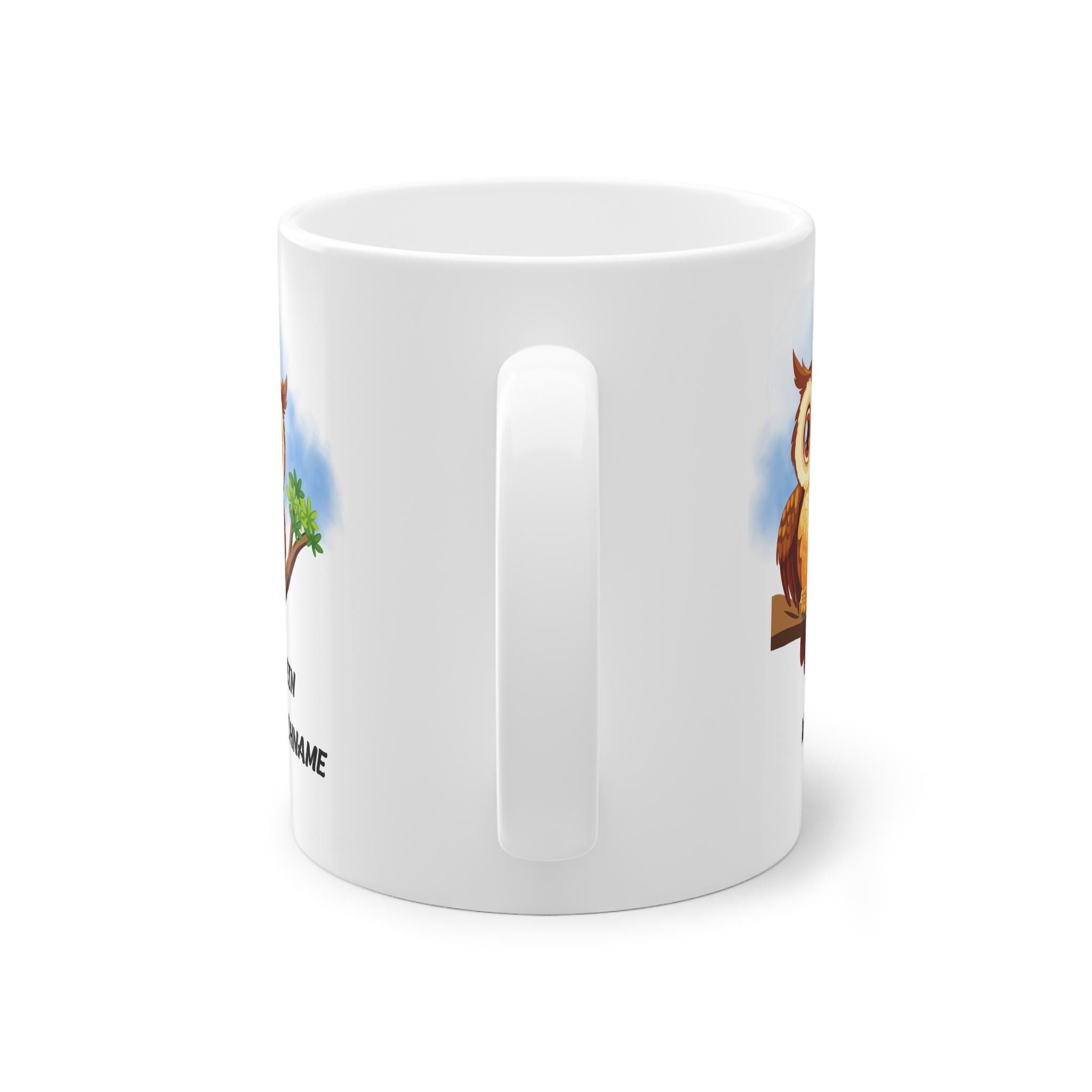 Personalized white ceramic mug featuring an owl on a branch and a sky motif. Optionally, you can add your name. This mug is suitable for children and adults and makes a great back-to-school gift, for kindergarten, the office, family, friends, and colleagues.