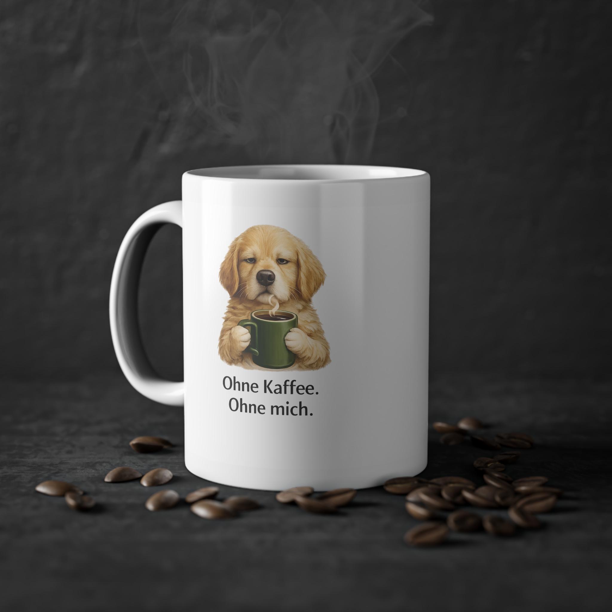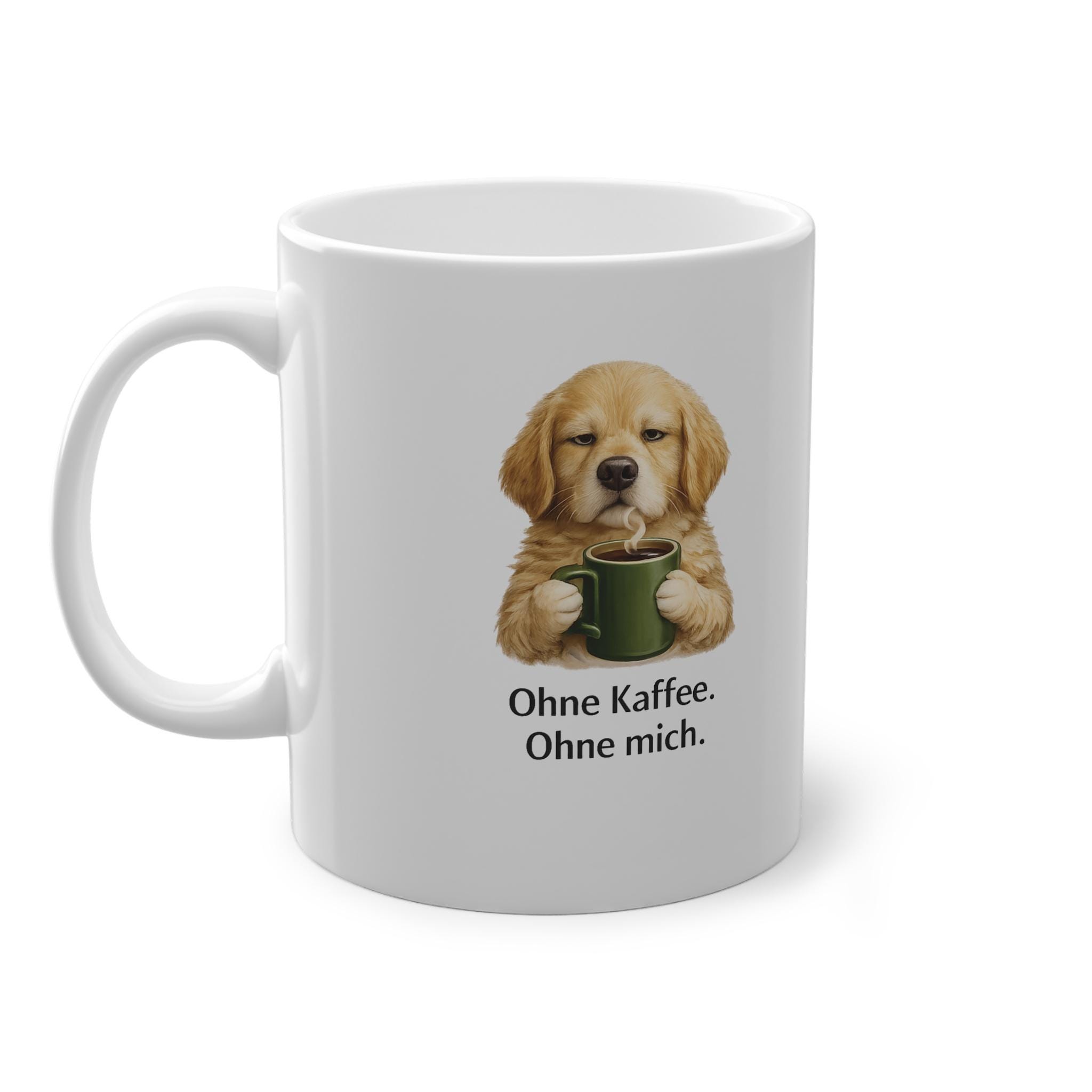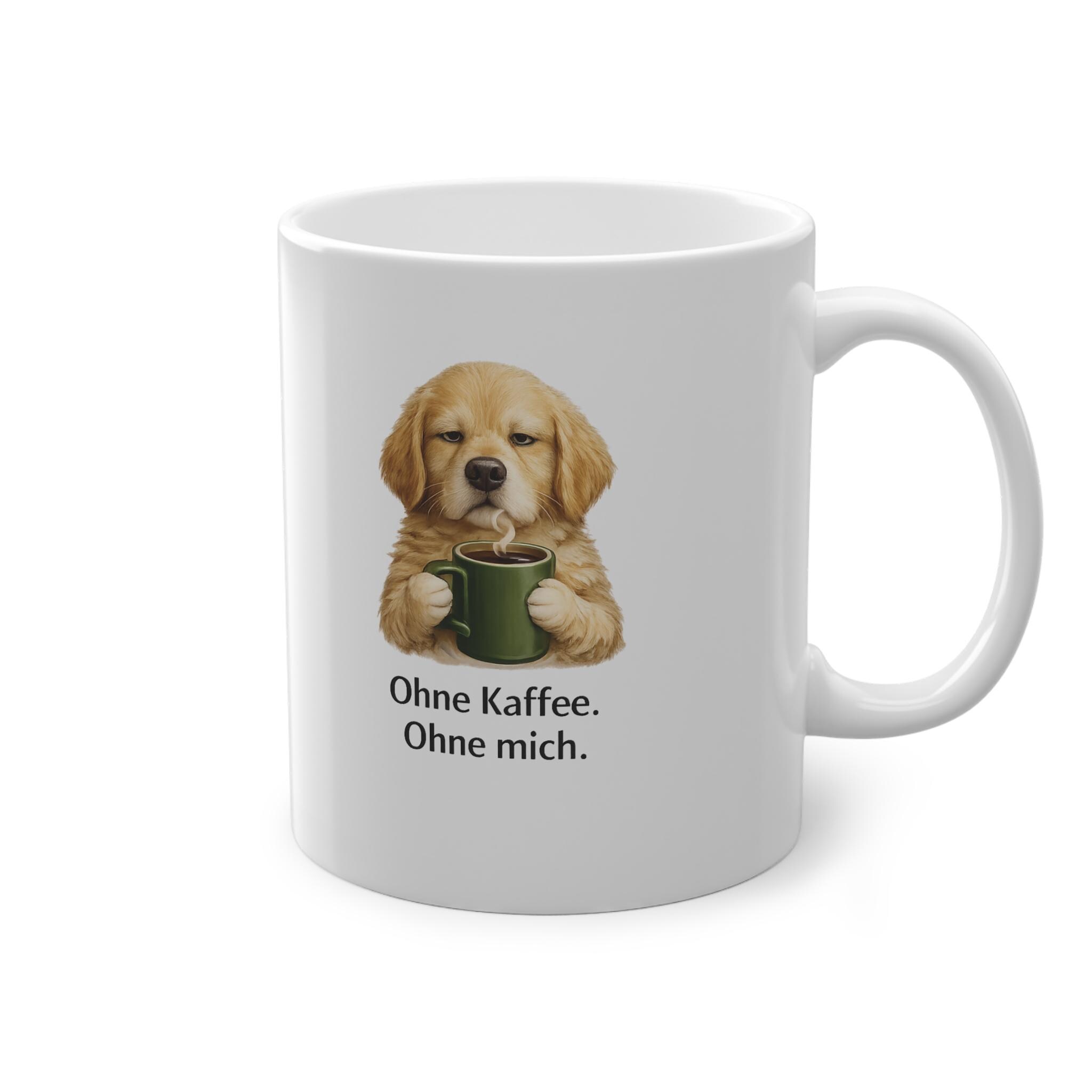 Gönnen Sie sich mit dieser glänzend weißen Keramiktasse einen ruhigen, gemütlichen Moment jeden Morgen. Ein verschlafener goldener Welpe, der eine grüne Tasse im Arm hält, ziert den Rand, darunter der sanfte deutsche Spruch „Ohne Kaffee. Ohne mich.“ Es fühlt sich an wie der erste, langsame Schluck vor dem eigentlichen Tag – warm, sanft und einfach unverzichtbar. Der umlaufende Druck sorgt für eine klare und farbenfrohe Illustration, und der C-förmige Henkel liegt angenehm in der Hand, während Sie den Kaffee genießen und Ihren Gedanken nachhängen. Diese Tasse findet ihren Platz in der Küchenecke, auf dem Schreibtisch oder bei langen Arbeitsnächten und bereichert den Alltag mit einer kleinen, wohltuenden Pause.