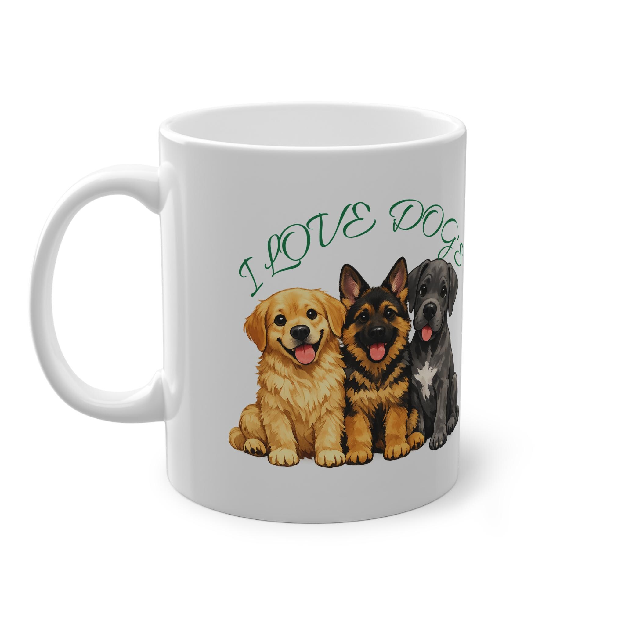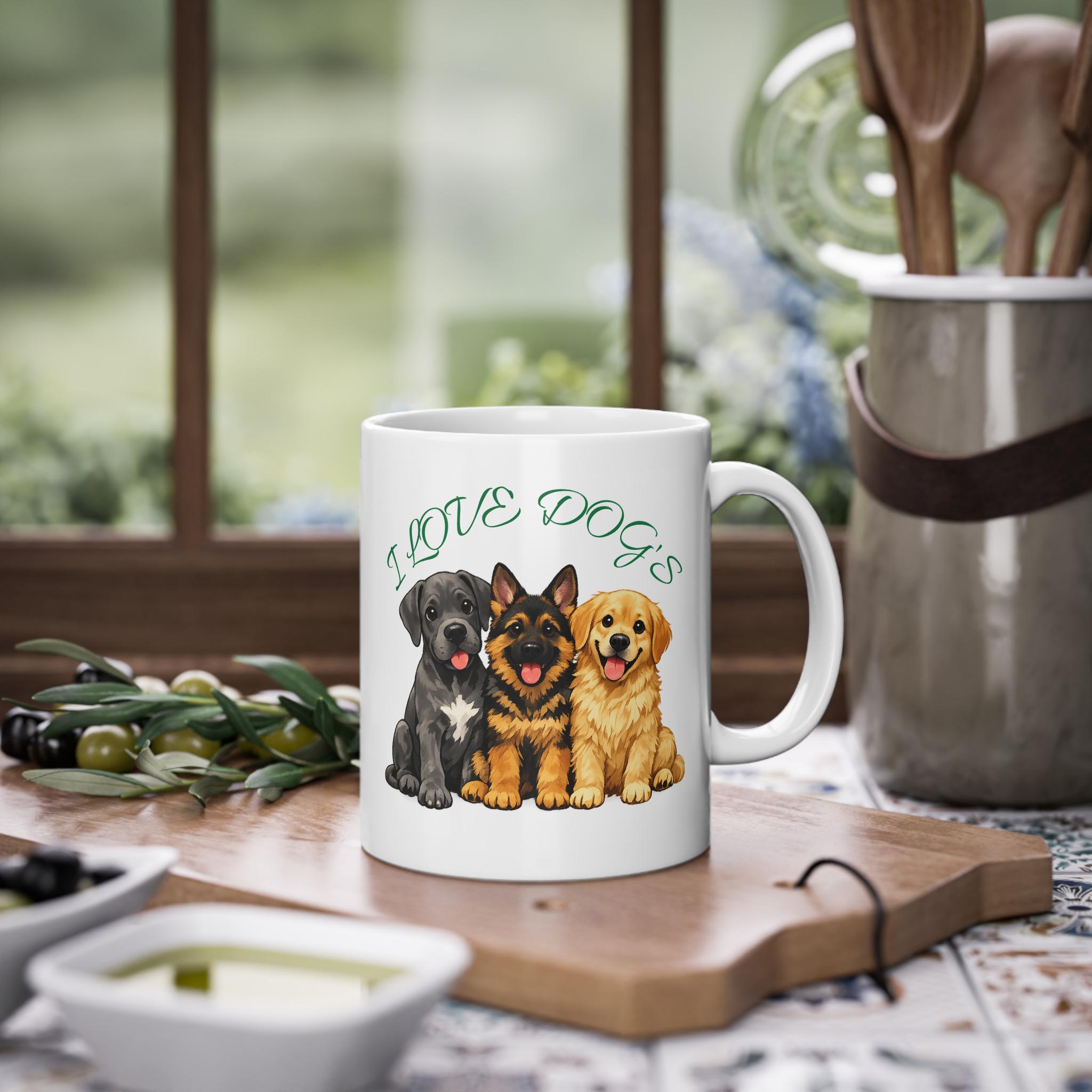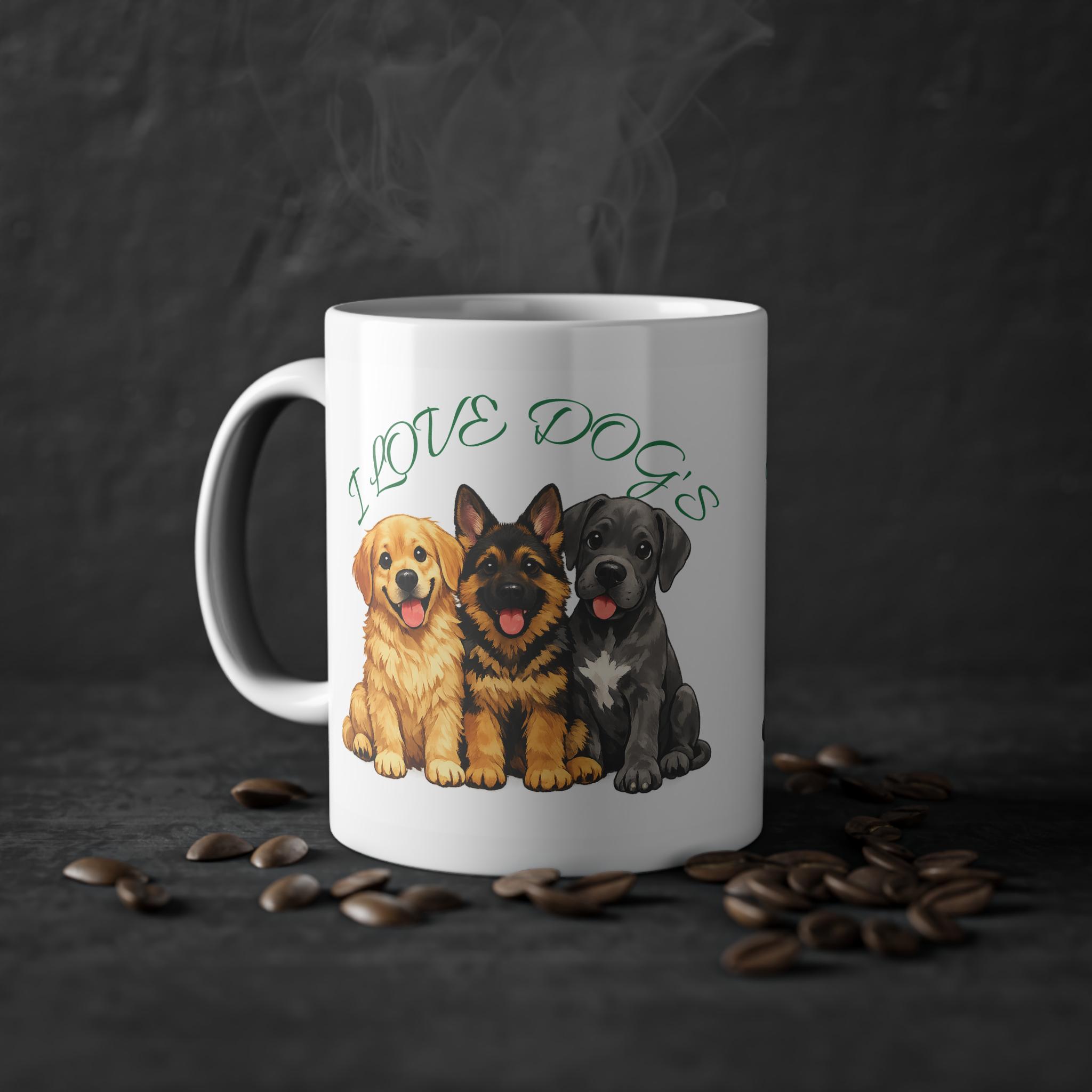 Schon beim Anheben dieser schlichten weißen Keramiktasse spürt man die Wärme. Drei Hundewelpen – ein Golden Retriever, ein Deutscher Schäferhund und ein schwarzer Labrador – sitzen mit großen Augen nebeneinander, die Zungen heraushängend und die Schwänze wedelnd. Darüber prangt in geschwungener grüner Schrift der Schriftzug „Ich liebe Hunde“. Diese Tasse macht aus einem ruhigen Morgen ein kleines Fest der Hundefreundschaft. Ob Kaffee, Tee oder eine Tasse Kakao – sie ist perfekt dafür. Der glänzende Rundumdruck sorgt für leuchtende Farben, und der stabile, C-förmige Henkel liegt angenehm in der Hand. Die Tasse ist für den täglichen Gebrauch gemacht: mikrowellengeeignet zum schnellen Aufwärmen und spülmaschinenfest für tausende Spülgänge, damit das Bild dauerhaft strahlend bleibt. Ob gemütlich mit dem Hund auf dem Sofa oder unterwegs mit einem vollen Reisebecher – diese Keramiktasse bereichert jeden Tag mit purer Hundeliebe.