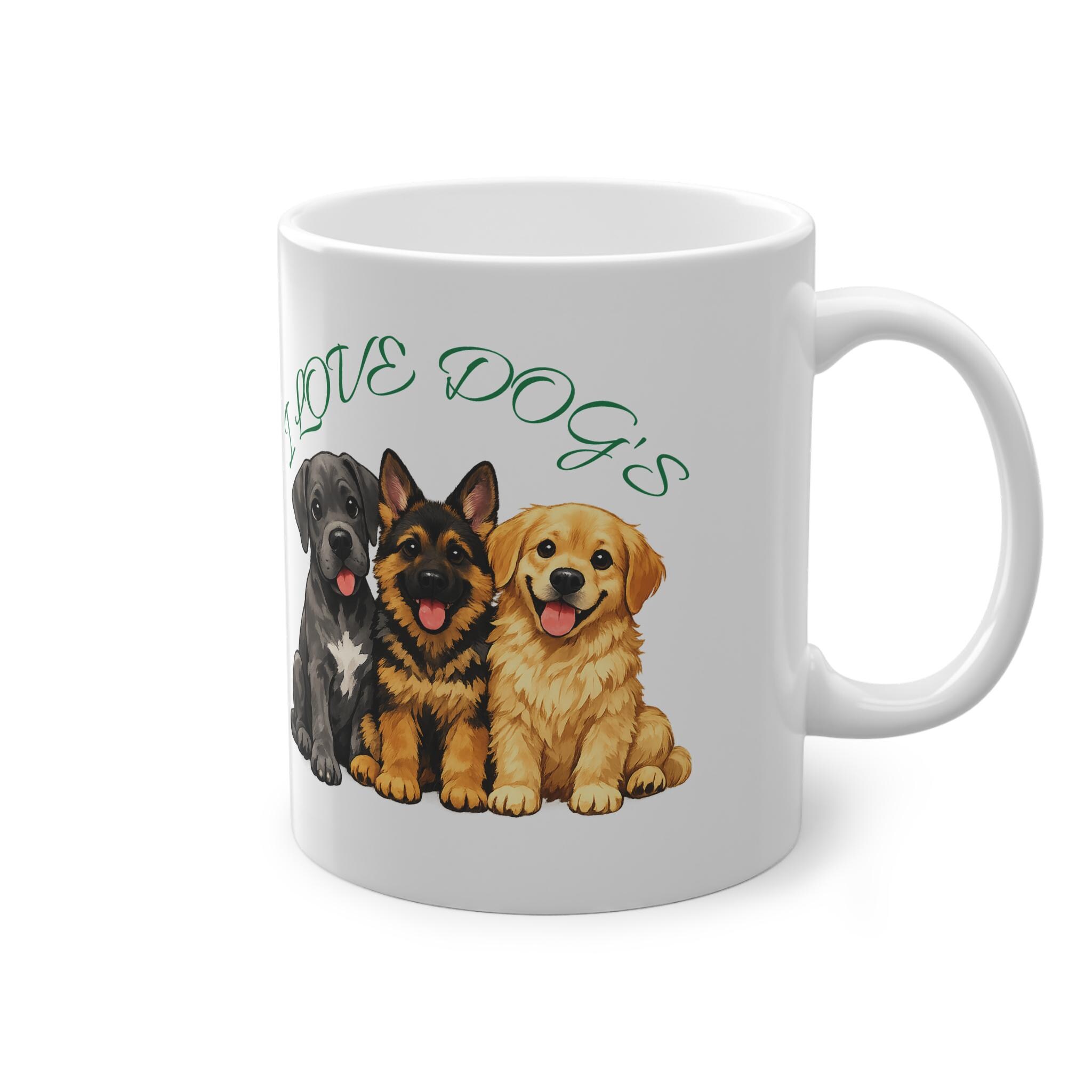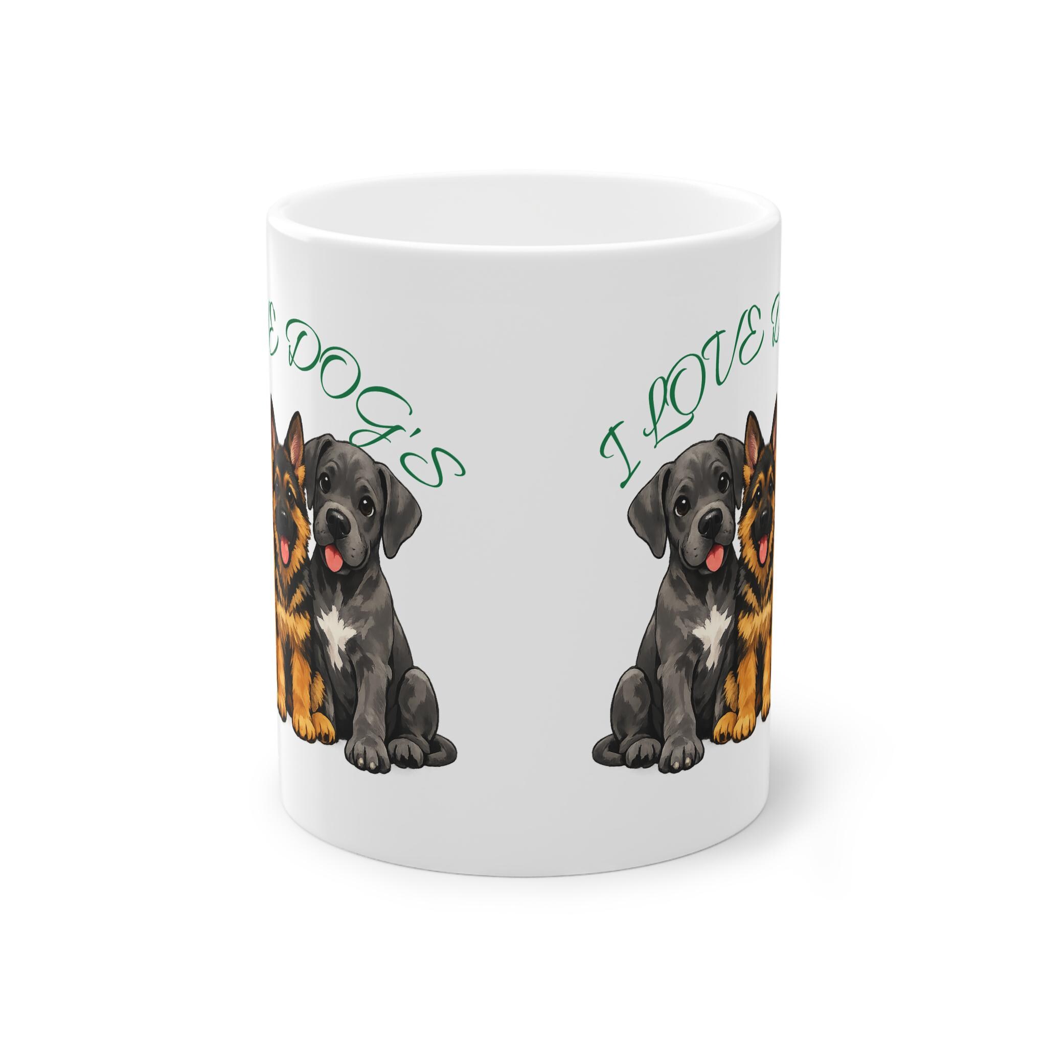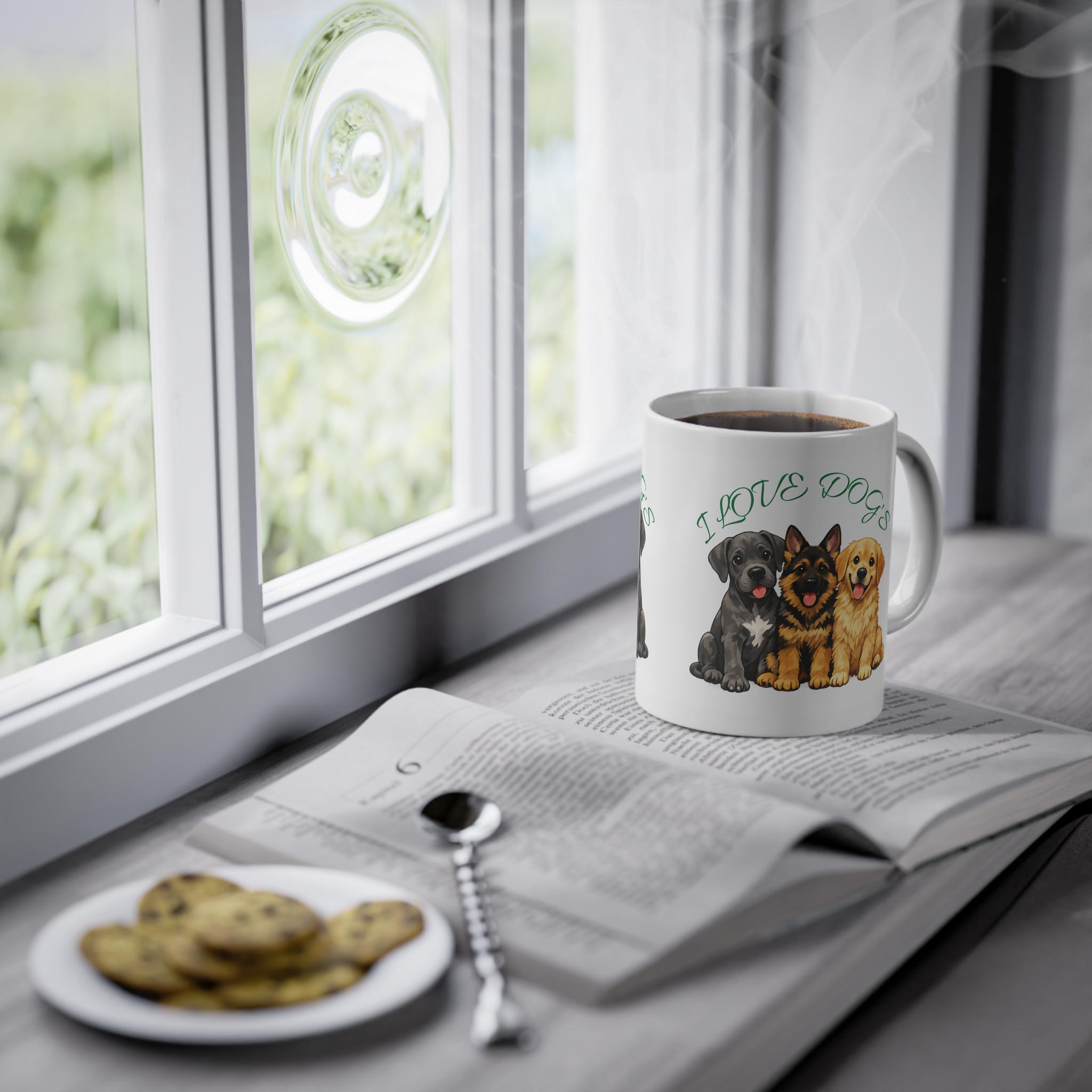 Schon beim Anheben dieser schlichten weißen Keramiktasse spürt man die Wärme. Drei Hundewelpen – ein Golden Retriever, ein Deutscher Schäferhund und ein schwarzer Labrador – sitzen mit großen Augen nebeneinander, die Zungen heraushängend und die Schwänze wedelnd. Darüber prangt in geschwungener grüner Schrift der Schriftzug „Ich liebe Hunde“. Diese Tasse macht aus einem ruhigen Morgen ein kleines Fest der Hundefreundschaft. Ob Kaffee, Tee oder eine Tasse Kakao – sie ist perfekt dafür. Der glänzende Rundumdruck sorgt für leuchtende Farben, und der stabile, C-förmige Henkel liegt angenehm in der Hand. Die Tasse ist für den täglichen Gebrauch gemacht: mikrowellengeeignet zum schnellen Aufwärmen und spülmaschinenfest für tausende Spülgänge, damit das Bild dauerhaft strahlend bleibt. Ob gemütlich mit dem Hund auf dem Sofa oder unterwegs mit einem vollen Reisebecher – diese Keramiktasse bereichert jeden Tag mit purer Hundeliebe.