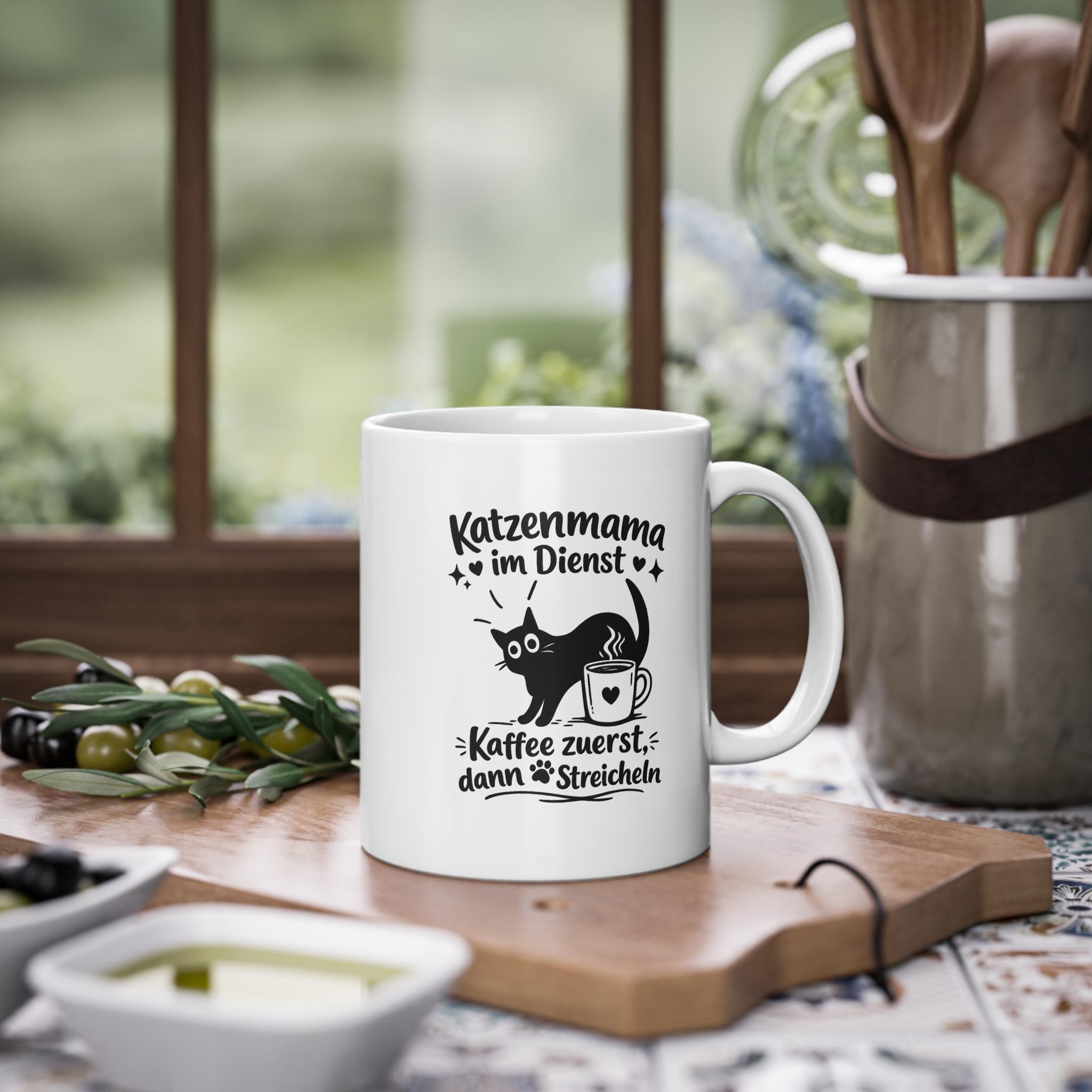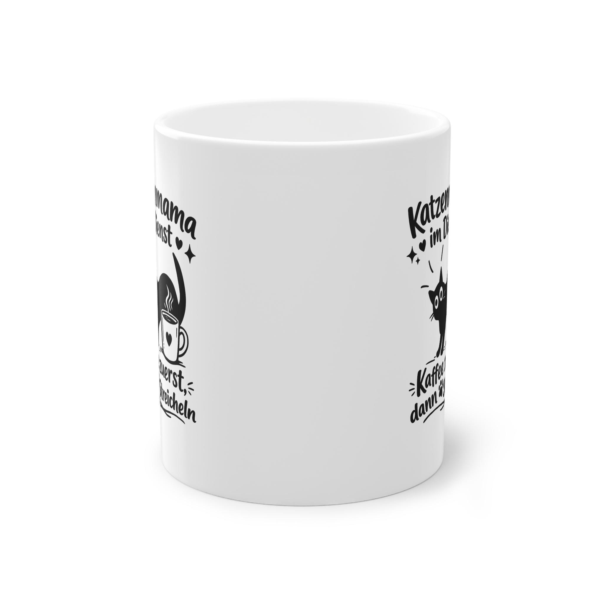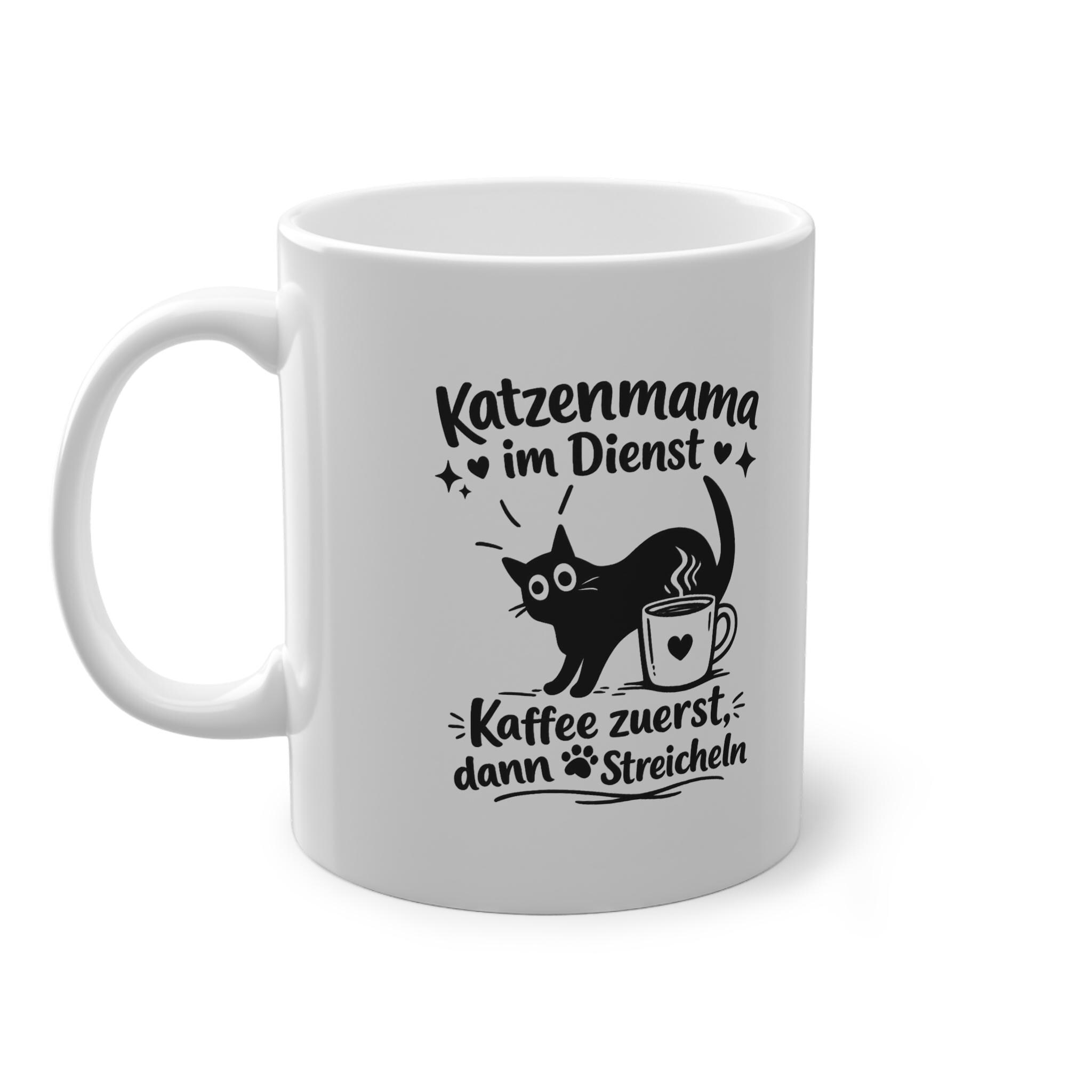 Eine strahlend glänzende Keramiktasse, die jeden anspricht, dessen Tag sich um einen schnurrenden Begleiter und eine heiße Tasse Kaffee dreht. Die schlichte schwarze Illustration – verspielte Katzensilhouette, dampfende Tasse und handgeschriebener deutscher Text – wirkt wie ein Augenzwinkern von einem anderen Katzenbesitzer. Es ist die perfekte Tasse für gemütliche Morgenstunden, ruhige Nachmittage oder wenn man vor den Erledigungen mit den Vierbeinern einen kleinen Energieschub braucht. Leicht und dennoch robust, liegt sie angenehm in der Hand und der umlaufende Aufdruck hebt sich mit klarem Kontrast vom weißen Keramikboden ab. Genießen Sie sie, wenn Sie entspannt in den Tag starten, eine Pause zwischen den Aufgaben einlegen oder es sich mit Ihrer Katze zu Fuß gemütlich machen und lesen möchten.