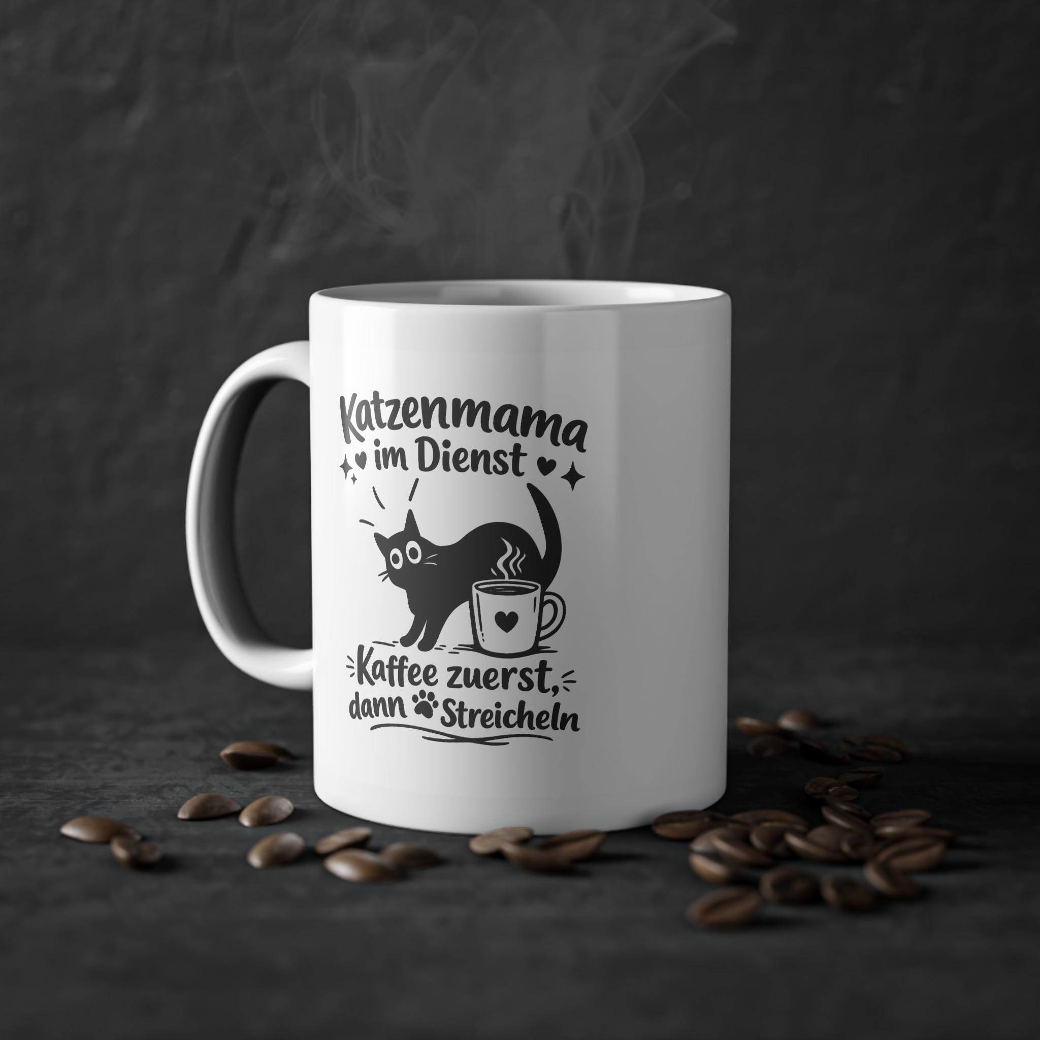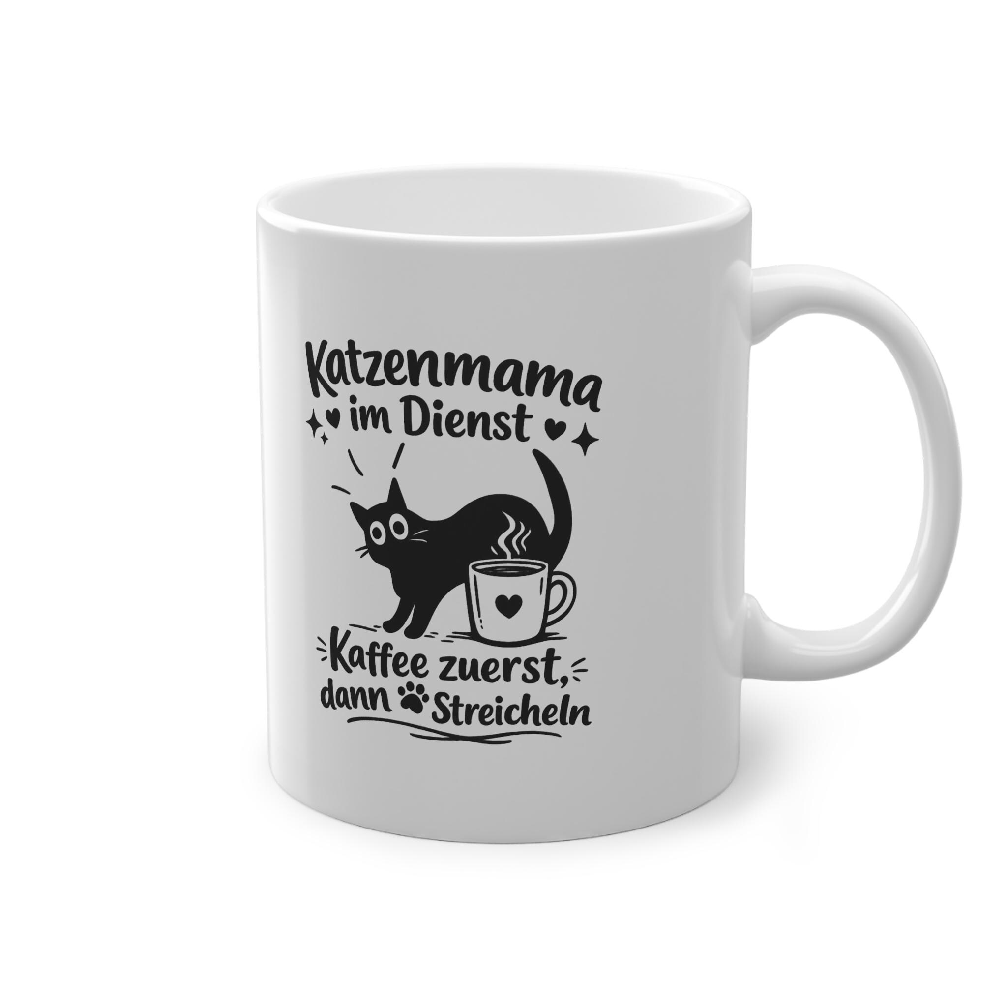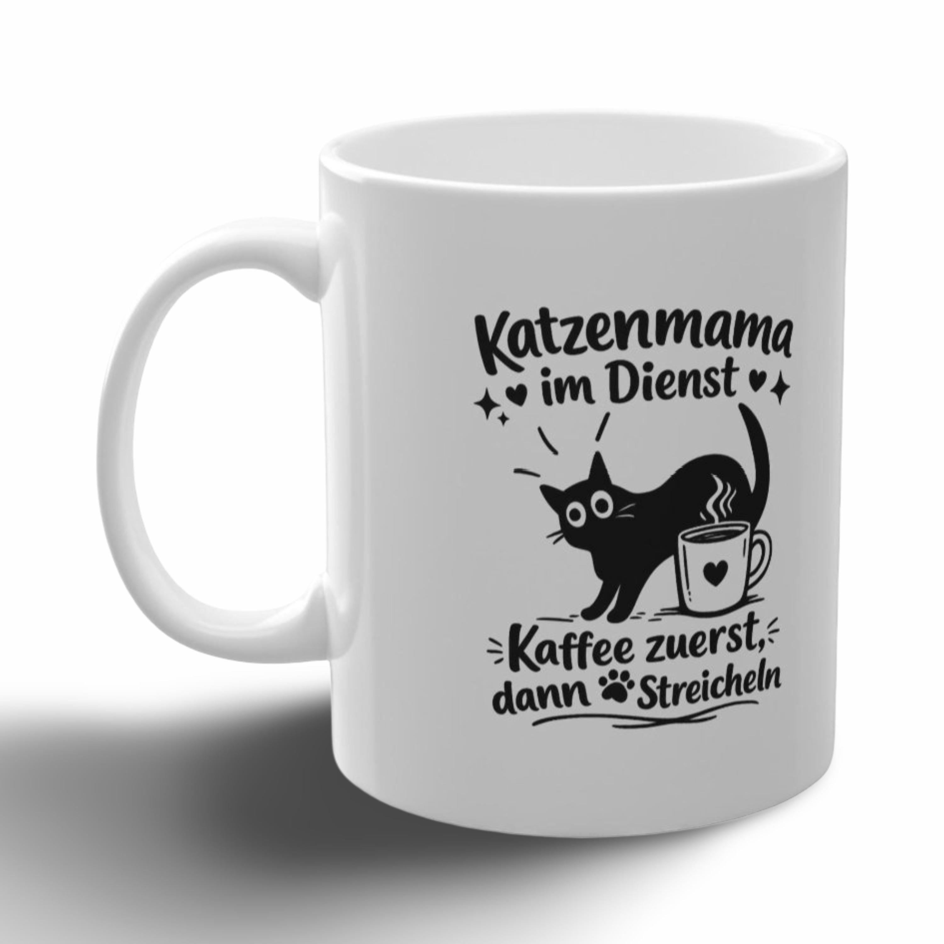 Eine strahlend glänzende Keramiktasse, die jeden anspricht, dessen Tag sich um einen schnurrenden Begleiter und eine heiße Tasse Kaffee dreht. Die schlichte schwarze Illustration – verspielte Katzensilhouette, dampfende Tasse und handgeschriebener deutscher Text – wirkt wie ein Augenzwinkern von einem anderen Katzenbesitzer. Es ist die perfekte Tasse für gemütliche Morgenstunden, ruhige Nachmittage oder wenn man vor den Erledigungen mit den Vierbeinern einen kleinen Energieschub braucht. Leicht und dennoch robust, liegt sie angenehm in der Hand und der umlaufende Aufdruck hebt sich mit klarem Kontrast vom weißen Keramikboden ab. Genießen Sie sie, wenn Sie entspannt in den Tag starten, eine Pause zwischen den Aufgaben einlegen oder es sich mit Ihrer Katze zu Fuß gemütlich machen und lesen möchten.