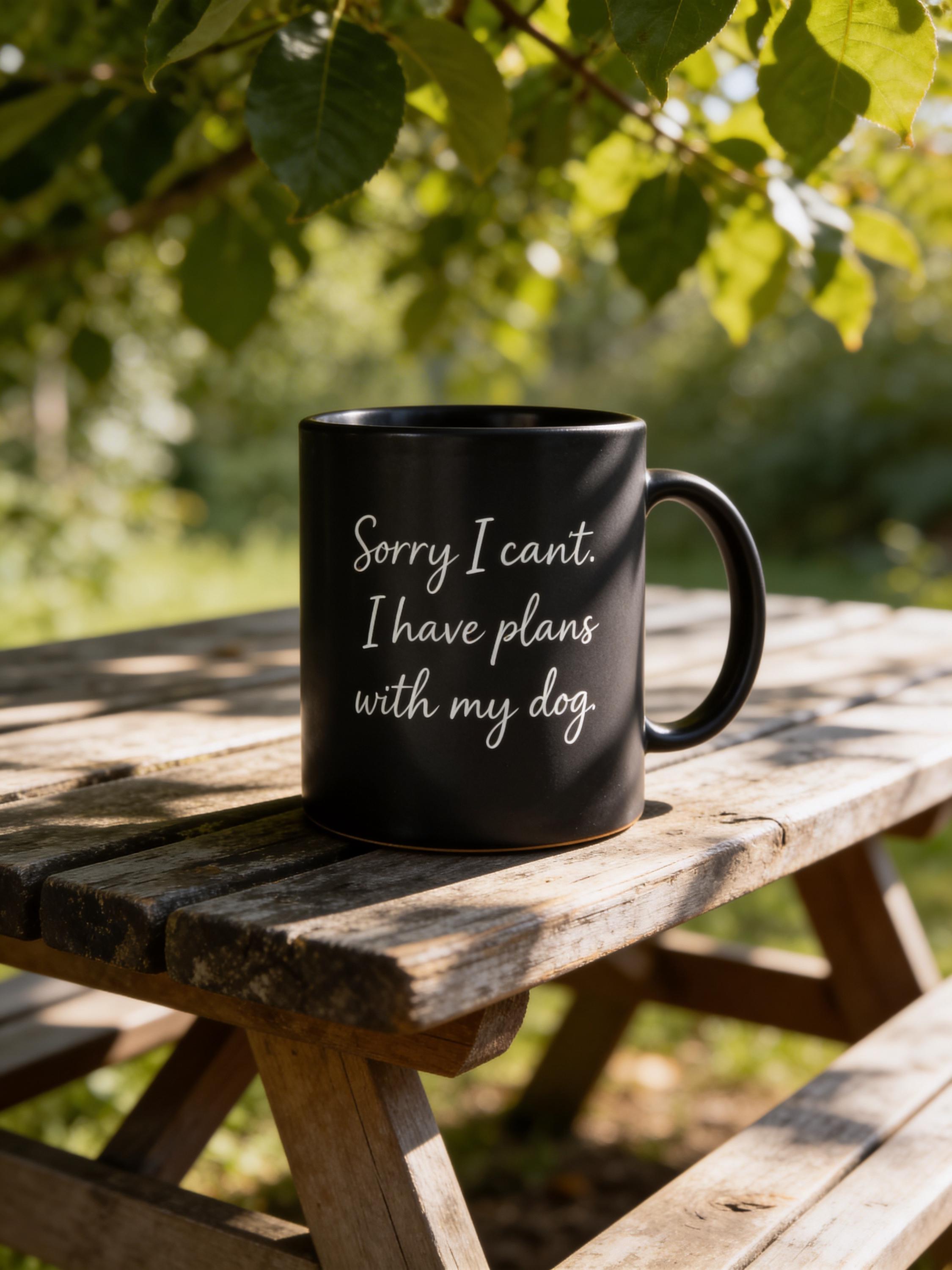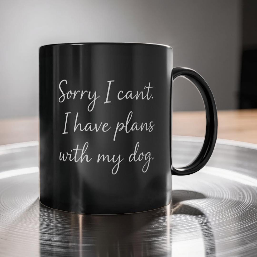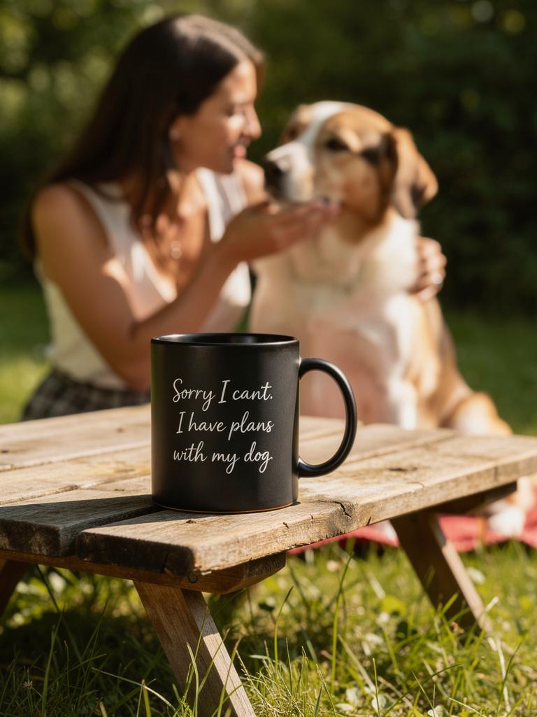 A sleek black ceramic mug that speaks in soft, handwritten white script. The wraparound design reads like a quick, relatable confession—quiet humor for mornings when plans get rerouted by a furry friend. Smooth glossy finish catches light and makes the white lettering stand out, while the comfortable C-handle fits naturally in your hand. Warm coffee, tea, or cocoa feels cozier against the deep black surface, turning an ordinary brew into a small, personal moment. This mug belongs on the kitchen counter of someone who prefers real moments over forced plans—perfect to reach for during slow weekend mornings, pet playdates, or when writing a to-do list that includes a nap on the couch with a dog nearby.