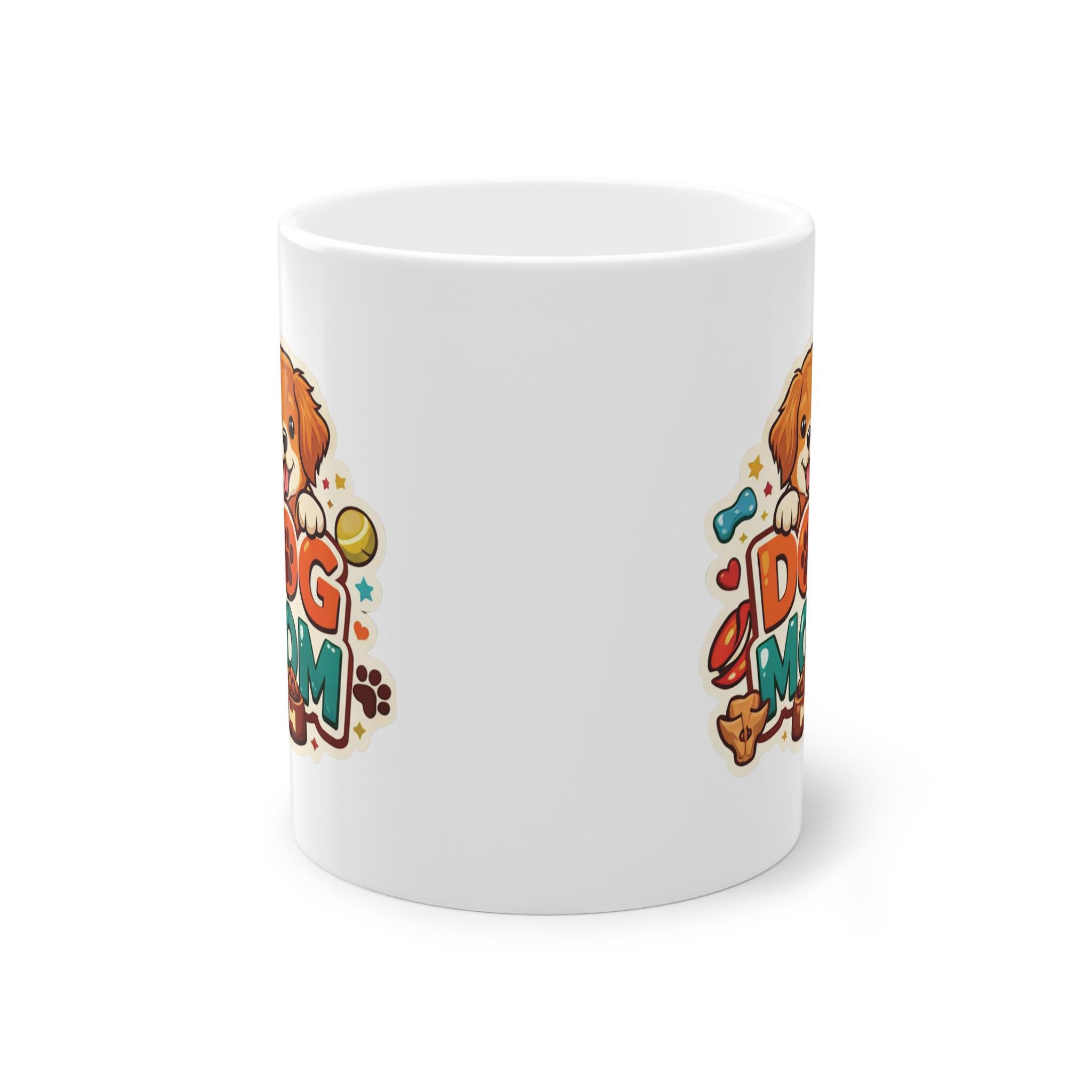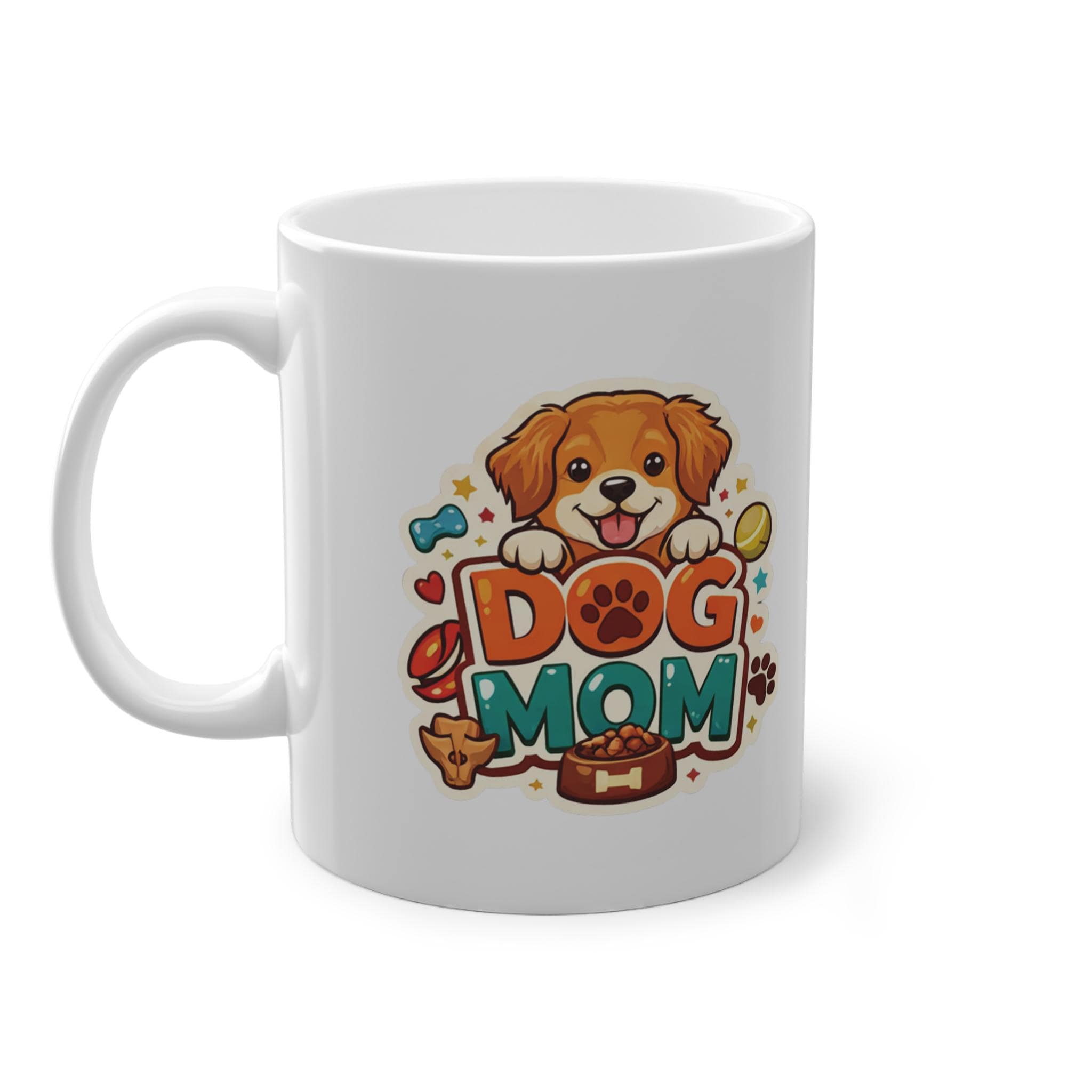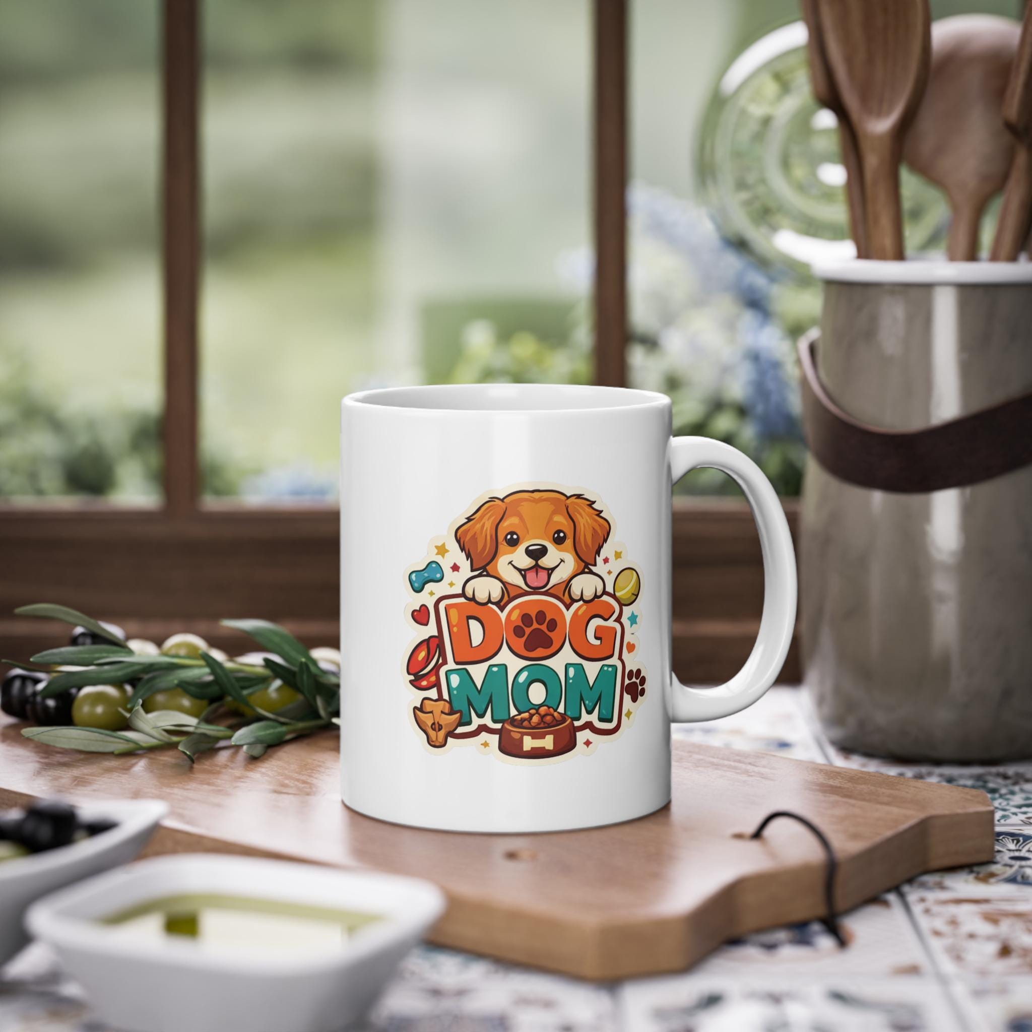 Warm mornings start here — a glossy white ceramic mug that carries a cheerful, illustrated celebration of the bond between a dog and their human. The playful artwork features a happy pup peeking over bold, colorful lettering that reads “Dog Mom,” surrounded by tiny treats, toys, and paw prints. It feels like a little moment of joy mid-week: a familiar weight in hand, a bright image that sparks a smile, and the quiet reassurance of canine companionship. Mug sits nicely on a desk, kitchen counter, or beside a favorite book, offering a small, daily reminder of the messy, loyal love of pet parenthood. Simple, dependable, and full of personality — this mug blends everyday utility with a warm, personal touch for anyone who likes their coffee with a side of wagging tail energy.