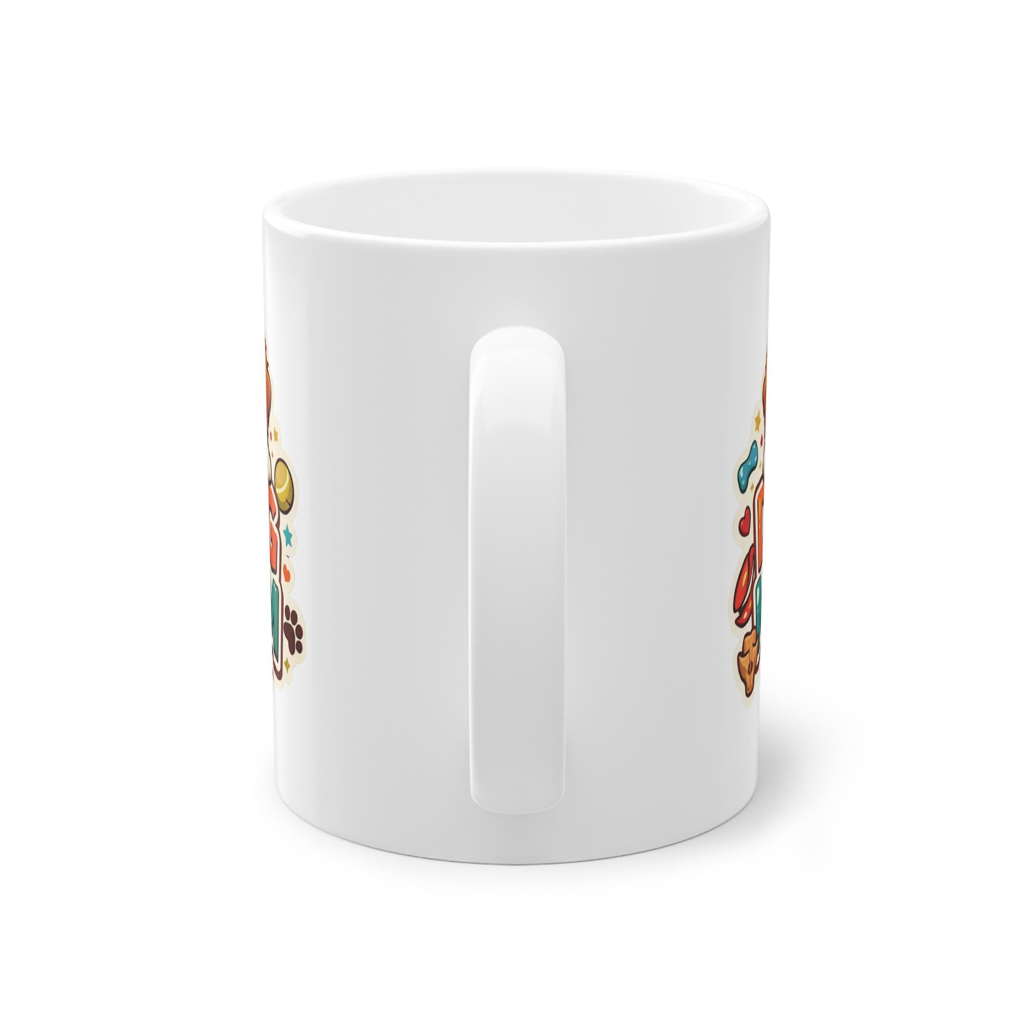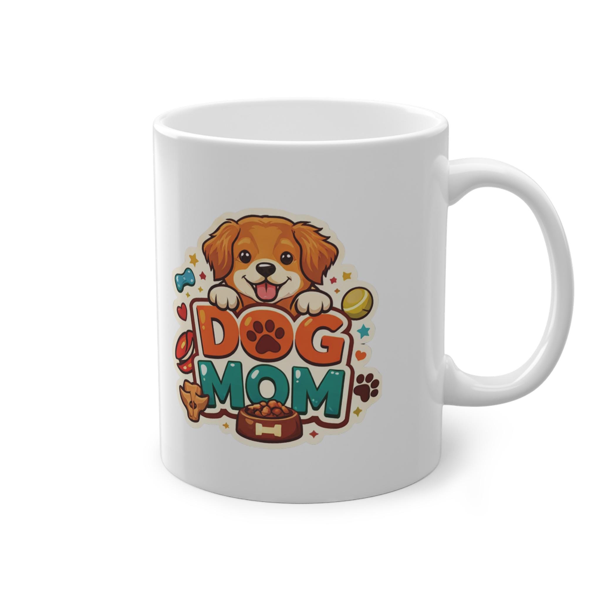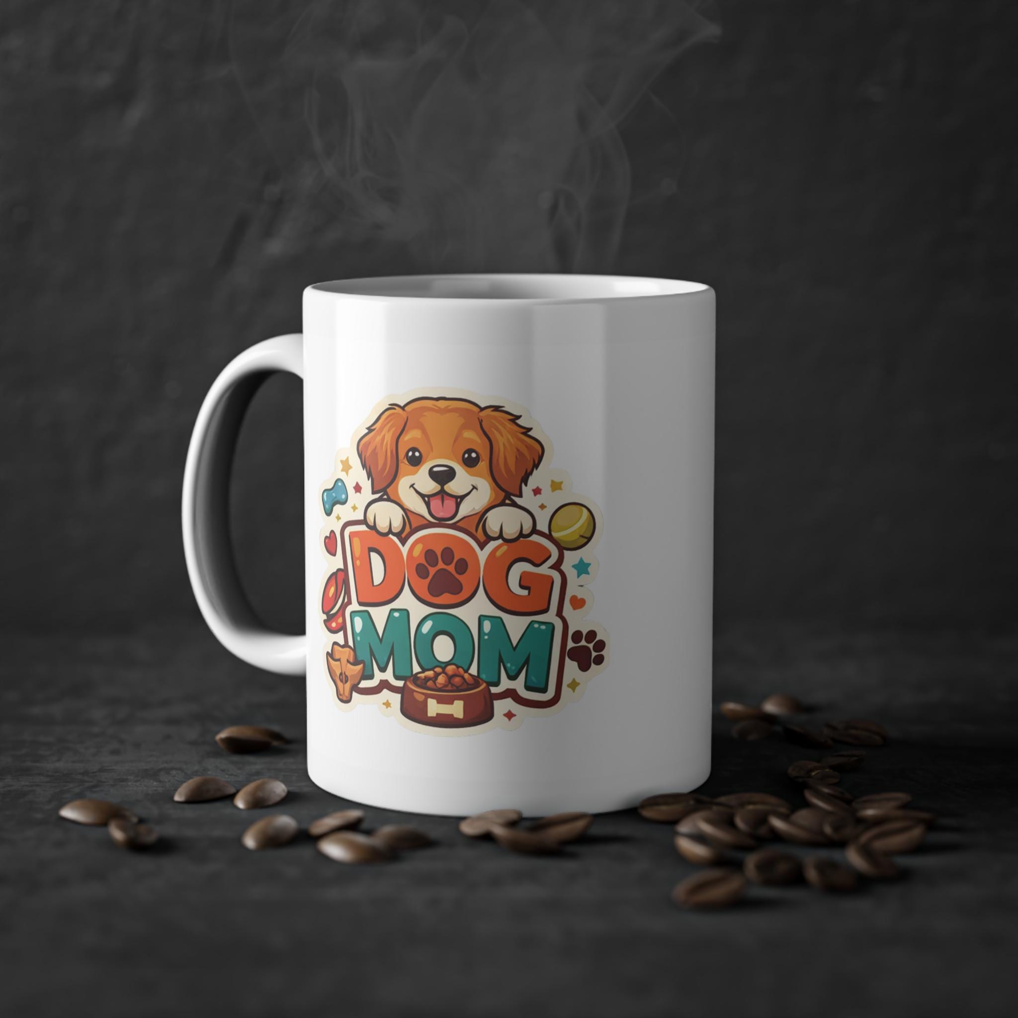 Warm mornings start here — a glossy white ceramic mug that carries a cheerful, illustrated celebration of the bond between a dog and their human. The playful artwork features a happy pup peeking over bold, colorful lettering that reads “Dog Mom,” surrounded by tiny treats, toys, and paw prints. It feels like a little moment of joy mid-week: a familiar weight in hand, a bright image that sparks a smile, and the quiet reassurance of canine companionship. Mug sits nicely on a desk, kitchen counter, or beside a favorite book, offering a small, daily reminder of the messy, loyal love of pet parenthood. Simple, dependable, and full of personality — this mug blends everyday utility with a warm, personal touch for anyone who likes their coffee with a side of wagging tail energy.